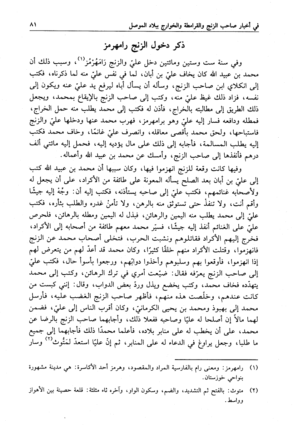 وفيها كانت وقعة للزنج انهزموا فيها ، وكان سببها أن محمد بن عبيد الله كتب إلى علي بن أبان بعد الصلح يسأله المعونة على طائفة من الأكراد ، على أن يجعل له ولأصحابه غنائمهم ، فكتب علي إلى صاحبه يستأذنه ، فكتب إليه أن : وجه إليه جيشاً وأقم أنت ، ولا تنفذ حتى تستوثق منه الرهن ، ولا تأمن غدره والطلب بثأره ، فكتب علي إلى محمد يطلب منه اليمين والرهائن ، فبذل له اليمين ومطلة بالرهائن ، فلحرص علي على الغنائم أنفذ إليه جيشاً ، فسير محمد معهم طائفة من أصحابه إلى الأكراد ، فخرج إليهم الأكراد فقاتلوهم ونشبت الحرب ، فتخلى أصحاب محمد عن الزنج فانهزموا ، وقتلت الأكراد منهم خلقاً كثيراً ، وكان محمد قد أعد لهم من يتعرض لهم إذا انهزموا ، فأوقعوا بهم وسلبوهم وأخذوا دوابهم ، ورجعوا بأسوأ حال ، فكتب علي إلى صاحب الزنج يعرفه فقال : ضيعت أمري في ترك الرهائن ، وكتب إلى محمد يتهدده فخاف محمد ، وكتب يخضع ويذل ورد بعض الدواب ، وقال : إنني كبست من كانت عندهم وخلصت هذه منهم ، فأظهر صاحب الزنج الغضب عليه ، فأرسل محمد إلى بهبوذ ومحمد بن يحيى الكرماني ، وكان أقرب الناس إلى علي ، فضمن لهما مالا إن أصلحا له علياً وصاحبه ففعلا ذلك ، وأجابهما صاحب الزنج بالرضا عن محمد ، على أن يخطب له على منابر بلاده ، فأعلما محمداً ذلك فأجابهما إلى جميع ما طلبا ، وجعل براوغ في الدعاء له على المنابر ، ثم إن علياً استعد لمتوث وسار