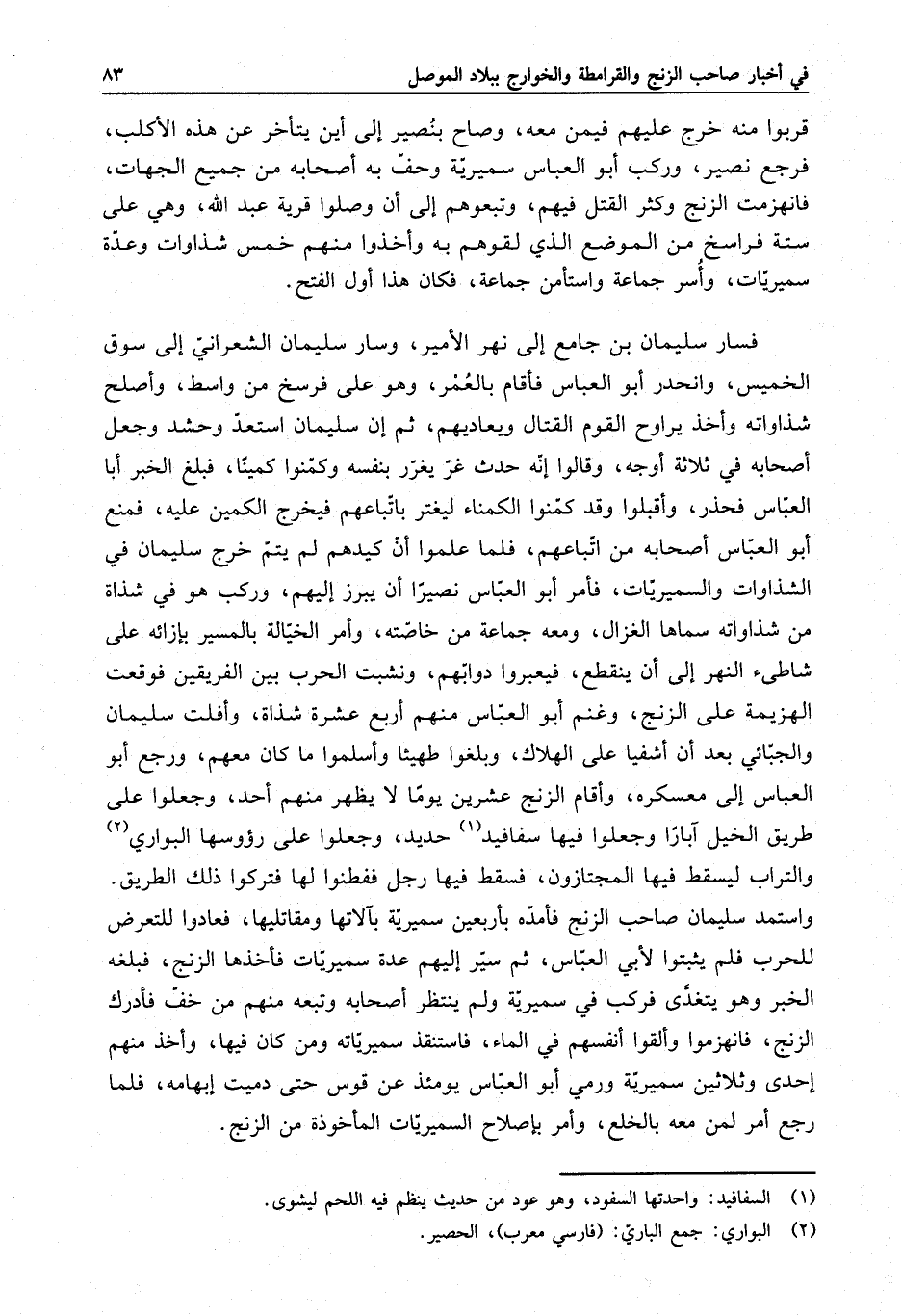 فسار سليمان بن جامع إلى نهر الأمير ، وسار سليمان الشعراني إلى سوق الخميس ، وانحدر أبو العباس فأقام بالعمر ، وهو على فرسخ من واسط ، وأصلح شذاواته وأخذ يراوح القوم القتال ويغاديهم ، ثم إن سليمان استعد وحشد وجعل أصحابه في ثلاثة أوجه ، وقالوا إنه حدث غر يغرر بنفسه وكمنوا كميناً ، فبلغ الخبر أبا العباس فحذره ، وأقبلوا وقد كمنوا الكمناء ليغتر بأتباعهم فيخرج الكمين عليه ، فمنع أبو العباس أصحابه من اتباعهم ، فلما علموا أن كيدهم لم يتم خرج سليمان من الشذاوات والسميريات ، فأمر أبو العباس نصيراً أن يبرز إليهم ، وركب هو في شذاة من شذاواته سماها الغزال ، ومعه جماعة من خاصته ، وأمر الخيالة بالمسير بازائه على شاطئ النهر إلى أن ينقطع ، فيعبروا دوابهم ، ونشبت الحرب بين الفريقين فوقعت الهزيمة على الزنج ، وغنم أبو العباس منهم أربع عشرة شذاة ، وأفلت سليمان والجبائي بعد أن أشفيا على الهلاك ، وبلغوا طهيثاً وأسلموا ما كان معهم ، ورجع أبو العباس إلى معسكره ، وأقام الزنج عشرين يوماً لا يظهر منهم أحد ، وجعلوا على طريق الخيل آباراً وجعلوا فيها سفافيد حديد ، وجعلوا على رؤوسها البواري والتراب ليسقط فيها المجتازون ، فسقط فيها رجل ففطنوا لها فتركوا ذلك الطريق . واستمد سليمان صاحب الزنج فأمده بأربعين سميرية بآلاتها ومقاتليها ، فعادوا للتعرض للحرب فلم يثبتوا لأبي العباس ، ثم سير إليهم عدة سميريات فأخذها الزنج ، فبلغه الخبر وهو يتغدى فركب في سميرية ولم ينتظر أصحابه وتبعه منهم من خف فأدرك الزنج ، فانهزموا وألقوا أنفسهم في الماء ، فاستنقذ سميرياته ومن كان فيها ، وأخذ منهم إحدى وثلاثين سميرية ورمى أبو العباس يومئذ عن قوس حتى دميت إبهامه ، فلما رجع أمر لمن معه بالخلع ، وأمر بإصلاح السميريات المأخوذة من الزنج .