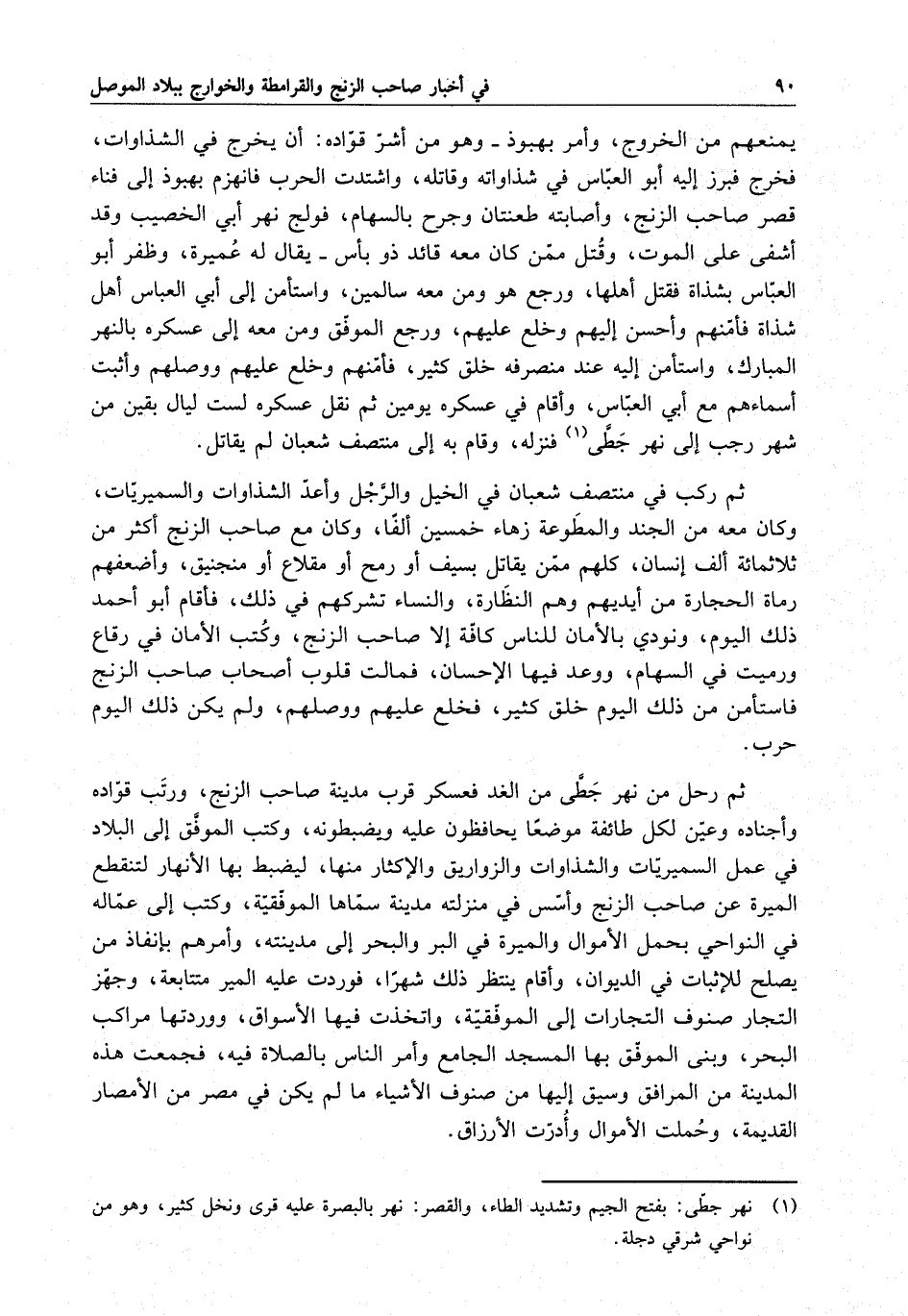يمنعهم من الخروج ، وأمر بهبود - وهو من أشر قواده ، أن يخرج من الشذاوات ، فخرج فبرز إليه أبو العباس في شذاواته وقاتله ، واشتدت الحرب فانهزم بهبود إلى فناء قصر صاحب الزنج ، وأصابته طعنتان وجرح بالسهام ، فولج نهر أبي الخصيب وقد أشفى على الموت ، وقتل ممن كان معه قائد ذو بأس - يقال له عميرة ، وظفر أبو العباس بشذاة فقتل أهلها ، ورجع هو ومن معه سالمين ، واستأمن إلى أبي العباس أهل شذاة فأمنهم وأحسن إليهم وخلع عليهم ، ورجع الموفق ومن معه إلى عسكره بالنهر المبارك ، واستأمن إليه عند منصرفه خلق كثير ، فأمنهم وخلع عليهم ووصلهم وأثبت أسماءهم مع أبي العباس ، وأقام في عسكره يومين لست ليال بقين من شهر رجب إلى نهر جطي فنزله ، وقام به إلى منتصف شعبان لم يقاتل .