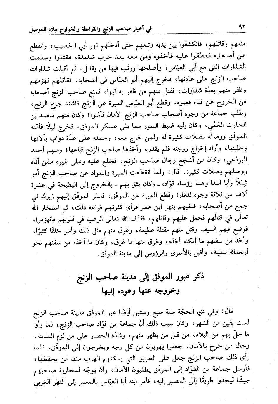 قال : وفي ذي الحجة سنة سبع وستين أيضاً عبر الموفق مدينة صاحب الزنج لست بقين من الشهر ، وكان سبب ذلك جماعة من قواد صاحب الزنج ، لما رأوا ما حل بهم من البلاء ، من قتل من يظهر منهم ، وشدة الحصار على من لزم المدينة ، وحال من خرج بالأمان ، وجعلوا يهربون من كل وجه ويخرجون إلى الموفق ، فلما رأى ذلك صاحب الزنج جعل على الطريق التي يمكنكم الهرب منها من يحفظها ، فأرسل جماعة من القواد إلى الموفق يطلبون الأمان ، وأن يوجه لمحاربة صاحبهم جيشاً ليجدوا طريقاً إلى المصير إليه ، فأمر ابنه أبا العباس بالمصير إلى النهر الغربي