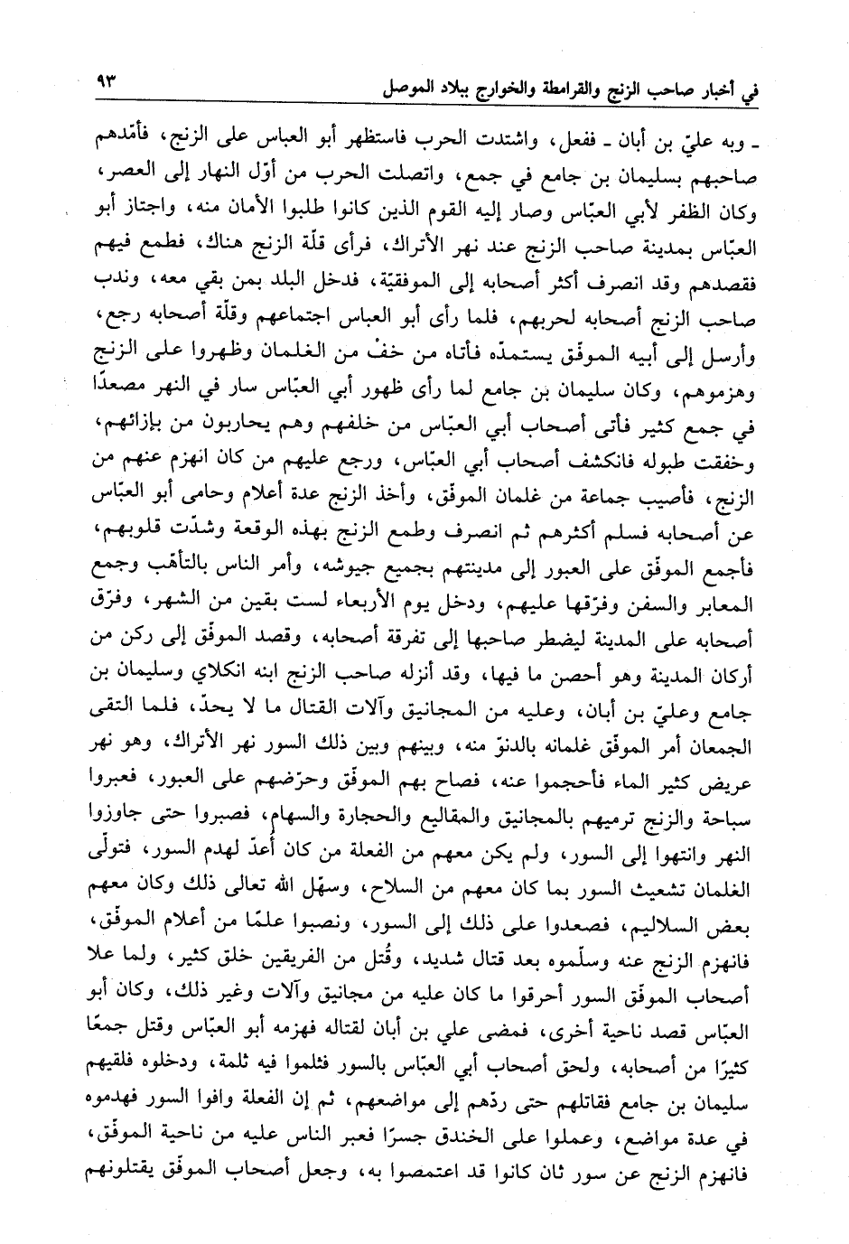 - وبه علي بن أبان - ففعل ، واشتدت الحرب فاستظهر أبو العباس على الزنج ، فأمدهم صاحبهم بسليمان بن جامع في جمع ، اتصلت الحرب من أول النهار إلى العصر ، وكان الظفر لأبي العباس وصار إليه القوم كانوا طلبوا الأمان منه ، واجتاز أبو العباس بمدينة صاحب الزنج عند نهر الأترك ، فرأى قلة الزنج هناك ، فطمع فيهم فقصدهم وقد انصرف أكثر أصحابه إلى الموفقية ، فدخل البلد بمن بقي معه ، وندب صاحب الزنج أصحابه لحربهم ، فلما رأى أبو العباس اجتماعهم وقلة أصحابه رجع ، وأرسل إلى أبيه الموفق يستمده فأتاه من خف من الغلمان وظهروا على الزنج وهزموهم ، وكان سليمان ابن جامع لما رأى ظهور أبي العباس سار في النهر مصعداً في جمع كثير فاتي أصحاب أبي العباس في خلفهم وهم يحاربون من بإزائهم ، وخفقت طبوله فانكشف أصحاب أبي العباس ، ورجع عليهم كان انهزم عنهم من الزنج ، فأصيب جماعة من غلمان الموفق ، وأخذ الزنج عدة أعلام وحامي أبو العباس عن أصحابه فسلم أكثرهم ثم انصرف وطمع الزنج بهذه الوقعة وشدت قلوبهم ، فأجمع الموفق على العبور إلى مدينتهم بجميع جيوشه ، وأمر الناس بالتأهب وجمع المعابر والسفن وفرقها عليهم ، ودخل يوم الأربعاء لست بقين من الشهر ، وفرق أصحابه على المدينة ليضطر صاحبها إلى تفرقة أصحابه ، وقصد الموفق إلى ركن من أركان المدينة وهو أحصن ما فيها ، وقد أنزله صاحب الزنج ابنه انكلاي وسليمان بن جامع وعلي بن أبان ، وعليه من المناجيق وآلات القتال ما لا يحد ، فلما التقى الجمعان أمر الموفق غلمانه بالدنو منه ، وبينهم وبين ذلك السور نهر الأتراك ، وهو نهر عريض كثير الماء فأحجموا عنه ، فصاح بهم الموفق وحرضهم على العبور ، فعبروا سباحة والزنج ترميهم بالمجانيق والمقاليع والحجارة والسهام ، فصبروا حتى جاوزوا النهر وانتهوا إلى السور ، ولم يكن معهم من الفعلة من كان أعد لهدم السور ، فتولى الغلمان تشعيث السور بما كان معهم من السلاح ، وسهل الله تعالى ذلك وكان معهم بعض السلاليم ، فصعدوا على ذلك إلى السور ، ونصبوا علماً من أعلام الموفق ، فانهزم الزنج عنه وسلموه بعد قتال شديد ، وقتل من الفريقين خلق كثير ، ولما علا أصحاب الموفق السور أحرقوا ما كان عليه من مجانيق وآلات وغير ذلك ، وكان أبو العباس قصد ناحية أخرى ، فمضى علي بن أبان لقتاله فهزمه أبو العباس وقتل جمعاً كثيراً من أصحابه ، ولحق أصحاب أبي العباس بالسور فثلموا فيه ثلمة ، ودخلوا فلقيهم سليمان ابن جامع فقاتلهم حتى ردهم إلى مواضعهم ، ثم إن الفعلة وافوا السور فهدموه في عدة مواضع ، وعملوا على الخندق جسر فعبر الناس عليه من ناحية الموفق ، فانهزم الزنج عن سور ثان كانوا قد اعتصموا به ، وجعل أصحاب الموفق يقتلونهم