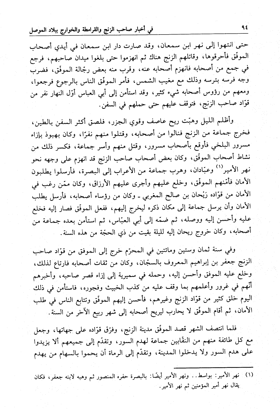 حتى انتهوا إلى نهر ابن سمعان ، وقد صارت دار ابن سمعان في أيدي أصحاب الموفق فأحرقوها ، وقاتلهم الزنج هناك ثم انهزموا حتى بلغوا ميدان صاحبهم ، فرجع في جمع من أصحابه عنه ، وقرب منه بعض رجالة الموفق ، فضرب وجه فرسه بترسه وذلك مع مغيب الشمس ، فأمر الموفق الناس بالرجوع فرجعوا ، ومعهم من رؤوس أصحابه شيء كثير ، وقد استأمن إلى أبي العباس أول النهار نفر من قواد صاحب الزنج ، فتوقف عليهم حتى حملهم في السفن . وأظلم الليل وهبت ريح عاصف وقوي الجزر ، فلصق أكثر السفن بالطين ، فخرج جماعة من الزنج فنالوا من أصحابه ، وقتلوا منهم نفر . وكان بهبوذ بازاء مسرور البلخي فأوقع بأصحاب مسرور ، وقتل منهم وأسر جماعة ، فكسر ذلك من نشاط أصحاب الموفق ، وكتن بعض أصحاب صاحب الزنج قد انهزم على وجهه نحو نهر الأمير وعبادان ، وهرب جماعة من الأعراب إلى البصرة ، فأرسلوا يطلبون الأمان فأمنهم الموفق ، وخلع عليهم وأجرى عليهم الأرزاق ، وكان ممن رغب في الأمان من قواده ريحان بن صالح المغربي - وكان من رؤساء أصحابه ، فأرسل يطلب الأمان وأن يرسل جماعة إلى مكان ذكره ليخرج إليهم ، ففعل الموفق فصار إليه فخلع عليه وأحسن إليه ووصله ، ثم ضمه إلى أبي العباس ، ثم استأمن بعده جماعة من أصحابه ، وكان خروج ريحان إليه لليلة بقيت من ذي الحجة من هذه السنة .