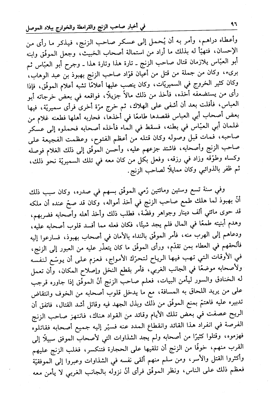 وأعطاه دراهم ؛ وأمر به أن يحمل إلى عسكر صاحب الزنج ، فيذكر ما رأى من الإحسان ، فتهيأ له بذلك ما أراد من استمالة أصحاب الخبيث ، وجعل الموفق وابنه أبو العباس يلا زمان قتال صاحب الزنج - تارة هذا وتارة هذا - وجرح أبو العباس ثم بريء ، وكان من جملة من قتل من أعيان قواد صاحب الزنج بهبوذ بن عبد الوهاب ، وكان كثير الخروج في السميريات ، وكان ينصب عليها أعلاماً تشبه أعلام الموفق ، فإذا رأى من يستضعفه أخذه ، فأخذ من ذلك مالاً جزيلاً ، فواقعة في بعض خرجاته أبو العباس ، فافلت بعد أن أشفى على الهلاك ، ثم خرج مرة أخرى فرأى سميرية ، فيها بعض أصحاب أبي العباس فقصدها طامعاً في أخذها ، فحاربه أهلها فطعنه غلام من غلمان أبي العباس في بطنه ، فسقط في الماء فأخذه أصحابه فحملوه إلى عسكر صاحبه ، فمات قبل وصوله وكان قتله من أعظم الفتوح ، وعظمت الفجيعة على صاحب الزنج وأصحابه ، واشتد جزعهم عليه ، وأحسن الموفق إلى ذلك الغلام فوصله وكساه وطوقه وزاد في رزقه ، وفعل بكل من كان معه في تلك السميرية نحو ذلك ، ثم ظفر بالذوائبي وكان ممايلاً لصاحب الزنج . وفي سنة تسع وستين ومائتين رمى الموفق بسهم في صدره ، وكان سبب ذلك أن بهبوذ لما هلك طمع صاحب الزنج في أخذ أمواله ، وكان قد صح عنده أن ملكه قد حوى مائتي ألف دينار وجواهر وفضة ، فطلب ذلك وأخذ أهله وأصحابه فضربهم ، وهدم ابنتيه طمعاً في المال فلم يجد شيئاً ، فكان فعله مما أفسد قلوب أصحابه عليه ، ودعاهم إلى الهرب منه ، فأمر الموفق بالنداء بالأمان في أصحاب بهنوذ ، فسارعوا إليه فألحقهم في العطاء ممن تقدم ، ورأى الموفق ما كان يتعذر عليه من العبور إلى الزنج ، في الأوقات التي تهب فيها الرياح لتحرك الأمواج ، فعزم على أن يوسع لنفسه ولأصحابه موضعاً في الجانب الغربي ، فأمر بقطع النخل وإصلاح المكان ، وأن تعمل له الخنادق والسور ليأمن البيات ، فعلم صاحب الزنج أن الموفق إذا جاوره قرب على من يريد اللحاق به المسافة ، مع ما يدخل قلوب أصحابه من الخوف وانتقاض تدبيره عليه فاهتم بمنع الموفق من ذلك وبذل الجهد فيه وقاتل أشد القتال ، فاتفق أن الريح عصفت في بعض تلك الأيام وقائد من القواد هناك ، فانتهز صاحب الزنج الفرصة في انفراد هذا القائد وانقطاع المدد عنه فسير إليه جميع أصحابه فقاتلوه فهزموه ، وقتلوا كثيراً من أصحابه ولم يجد الشذاوات التي لأصحاب الموفق سبيلاً إلى القرب منهم ، خوفاً من الزنج أن تلقيها على الحجارة فتنكسر ، فغلب الزنج عليهم وأكثروا القتل والأسر ، ومن سلم منهم ألقى نفسه في الشذاوات وعبروا إلى الموفقية فعظم ذلك على الناس ، ونظر الموفق فرأى أن نزوله بالجانب الغربي لا يأمن معه
