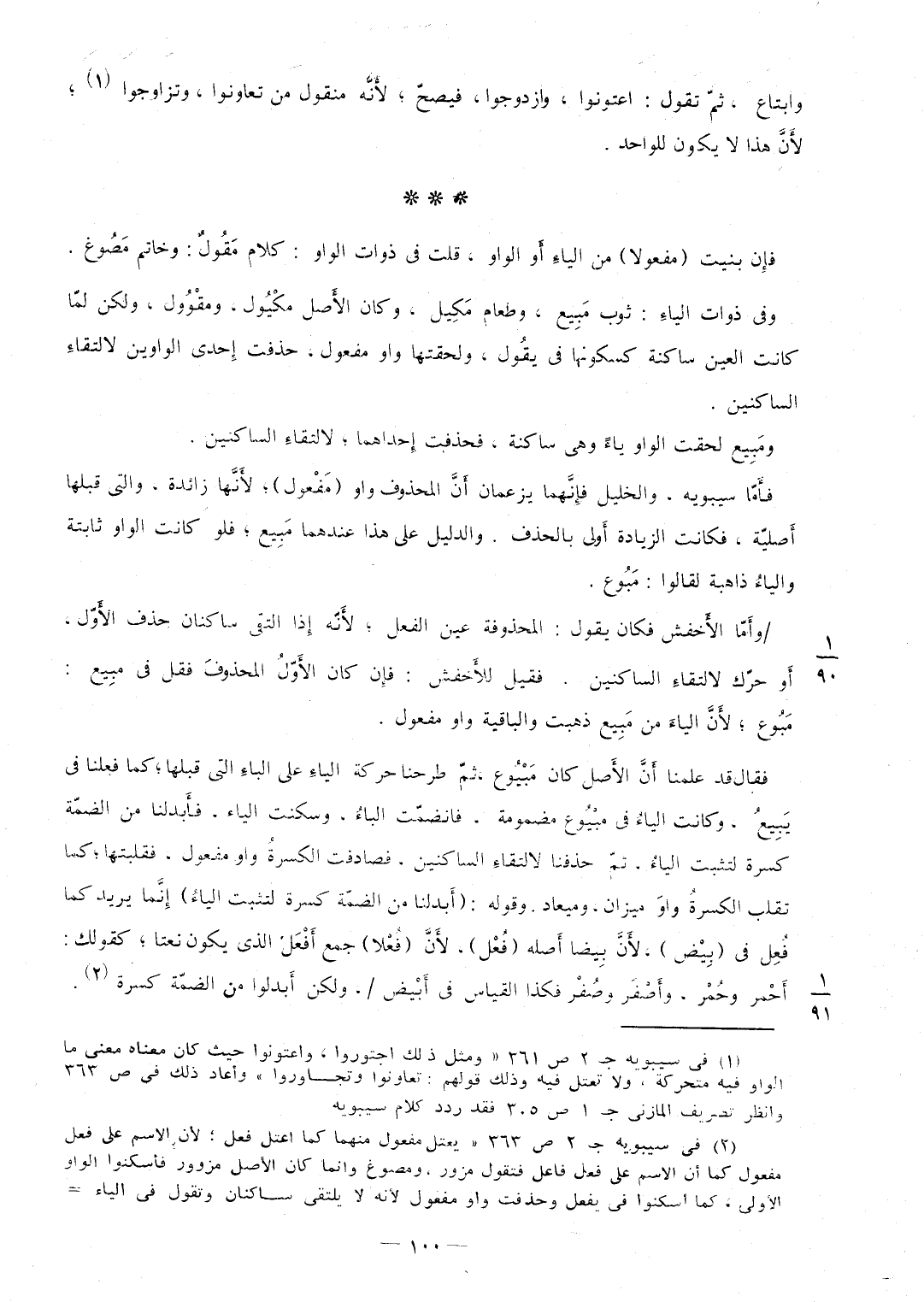 وابتاع ثمّ تَقول اعتونوا وازدوجوا فيصحّ لأَنَّه مَنْقُول من تعاونوا وتزاوجوا لأَنَّ هَذَا لَا يكون للْوَاحِد فإِن بنيت مَفْعُولا من الياءِ أَو الْوَاو قلت فِي ذَات الْوَاو كَلَام مَقُولٌ وَخَاتم مَصُوغ وَفِي ذَوَات الياءِ ثوب مَبِيع وَطَعَام مَكِيل وَكَانَ الأَصل مكْيُول ومقْوُول وَلَكِن لمّا كَانَت الْعين سَاكِنة كسكونها فِي يقُول ولحقتها وَاو مفعول حذفت إِحدى الواوين لالتقاءِ الساكنين ومَبِيع لحقت الْوَاو يَاء وَهِي سَاكِنة فحذفت إِحداهما لالتقاء الساكنين فأَمَّا سِيبَوَيْهٍ والخليل فإِنَّهما يزعمان أَنَّ الْمَحْذُوف وَاو مَفْعول لأَنَّها زَائِدَة وَالَّتِي قبلهَا أَصليّة فَكَانَت الزِّيَادَة أَولى بالحذف وَالدَّلِيل على هَذَا عِنْدهمَا مَبِيع فَلَو كَانَت الْوَاو ثَابِتَة والياءُ ذَاهِبَة لقالوا مَبُوع / وأَمَّا الأَخفش فَكَانَ يَقُول المحذوفة عني الْفِعْل لأَنَّه إِذا التقى ساكنان حذف الأَوّل أَو حرّك لالتقاء الساكنين فَقيل للأَخفش فإِن كَانَ الأَوّلُ الْمَحْذُوف فَقل فِي مبِيع مَبُوع لأَنَّ الياءَ من مَبِيع ذهبت والباقية وَاو مفعول فَقَالَ قد علمنَا أَنَّ الأَصل كَانَ مَبْيُوع ثمّ طرحنا حَرَكَة الياءِ على الباءِ الَّتِي قبلهَا كَمَا فعلنَا فِي يَبِيع وَكَانَت الياءُ فِي مبْيُوع مَضْمُومَة فانضمّت الباءُ وسكنت الْيَاء فأَبدلنا من الضمّة كسرة لتثبت الياءُ ثمَّ حذفنا لالتقاءِ الساكنين فصادفت الكسرةُ وَاو مفعول فقلبتها كَمَا تقلب الكسرةُ واوَ ميزَان وميعاد وَقَوله أَبدلنا من الضمّة كسرة لتثبت الياءُ إِنَّما يُرِيد كَمَا فُعِل فِي بِيْض لأَنَّ بِيضا أَصله فُعْل لأَنَّ فُعْلا جمع أَفْعَل الَّذِي يكون نعتا كَقَوْلِك أَحْمر وحُمْر وأَصْفَر وصُفْر فَكَذَا الْقيَاس فِي أَبْيض / وَلَكِن أَبدلوا من الضمّة كسرة
