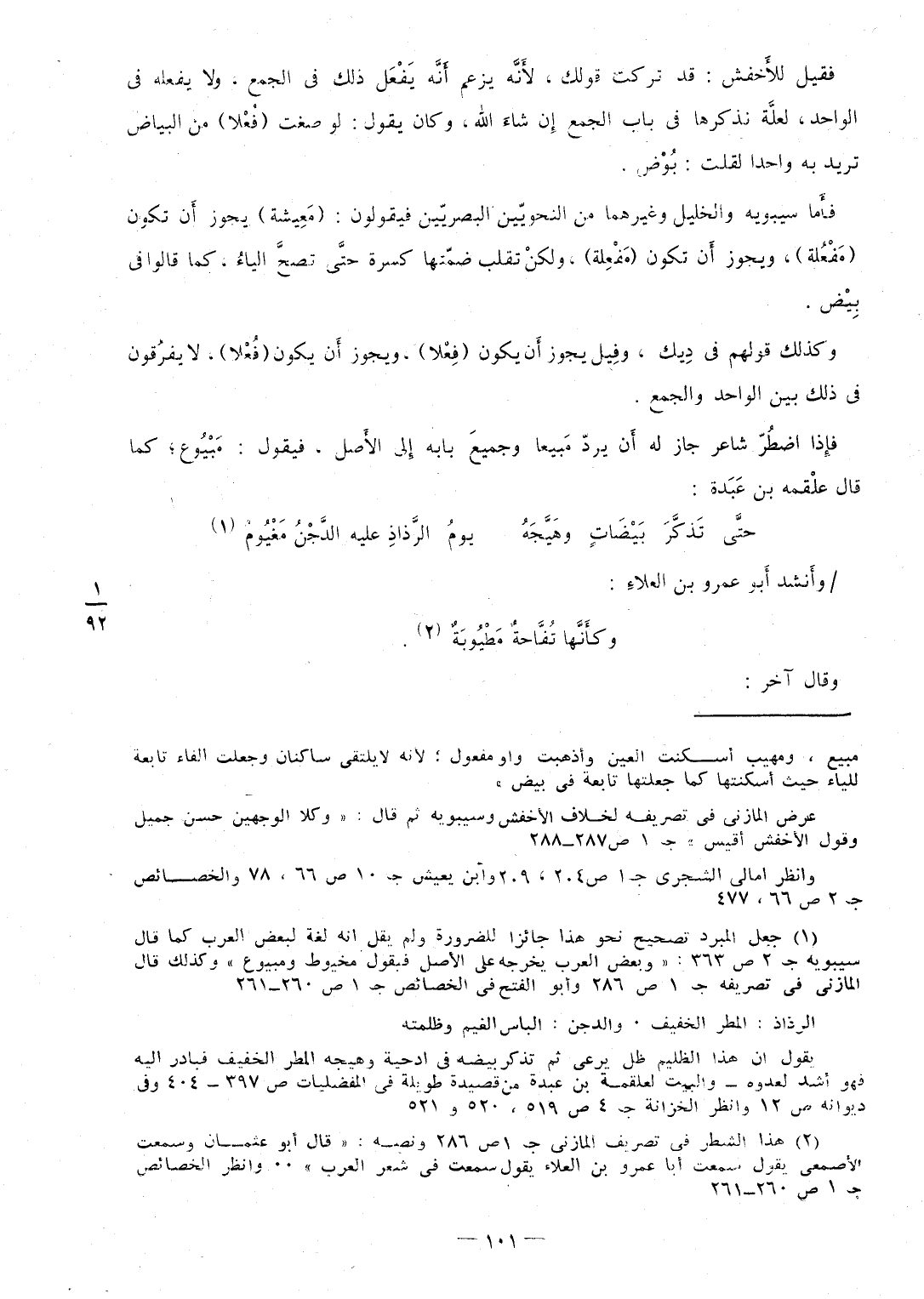 فَقيل للأَخفش قد تركت قَوْلك لأَنَّه يزْعم أَنَّه يَفْعَل ذَلِك فِي الْجمع وَلَا يَفْعَله فِي الْوَاحِد لعلَّة نذكرها فِي بَاب الْجمع إِن شاءَ الله وَكَانَ يَقُول لَو صغت فُعْلا من الْبيَاض تُرِيدُ بِهِ وَاحِدًا لَقلت بُوْض فأَما سِيبَوَيْهٍ والخليل وَغَيرهمَا من النحويّين البصريّين فَيَقُولُونَ مَعِيشة يجوز أَن تكون مَفْعُلة وَيجوز أَن تكون مَفْعِلة ولكنْ تقلب ضمّتها كسرة حتَّى تصحَّ الياءُ كَمَا قَالُوا فِي بِيْض وَكَذَلِكَ قَوْلهم فِي دِيك وفِيل يجوز أَن يكون فُعْلا وَيجوز ان يكون فعلا لَا يفرقون فِي ذَلِك بَين الْوَاحِد وَالْجمع فإِذا اضطُرّ شَاعِر جَازَ لَهُ أَن يردّ مَبيعا وجميعَ بَابه إِلى الأَصل فَيَقُول مَبْيُوع كَمَا قَالَ علْقمة بن عَبَدة