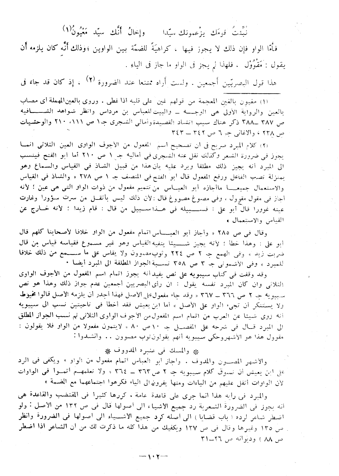 فأَمَّا الْوَاو فإِن ذَلِك لَا يجوز فِيهَا كراهيَةً للضمّة بَين الواوين وَذَلِكَ أَنَّه كَانَ يلْزمه أَن يَقُول مَقْوُوْل فَلهَذَا لم يجز فِي الْوَاو مَا جَازَ فِي الياءِ هَذَا قَول البصريّين أَجمعين وَلست أَراه مُمْتَنعا عِنْد الضَّرُورَة إِذ كَانَ قد جاءَ فِي