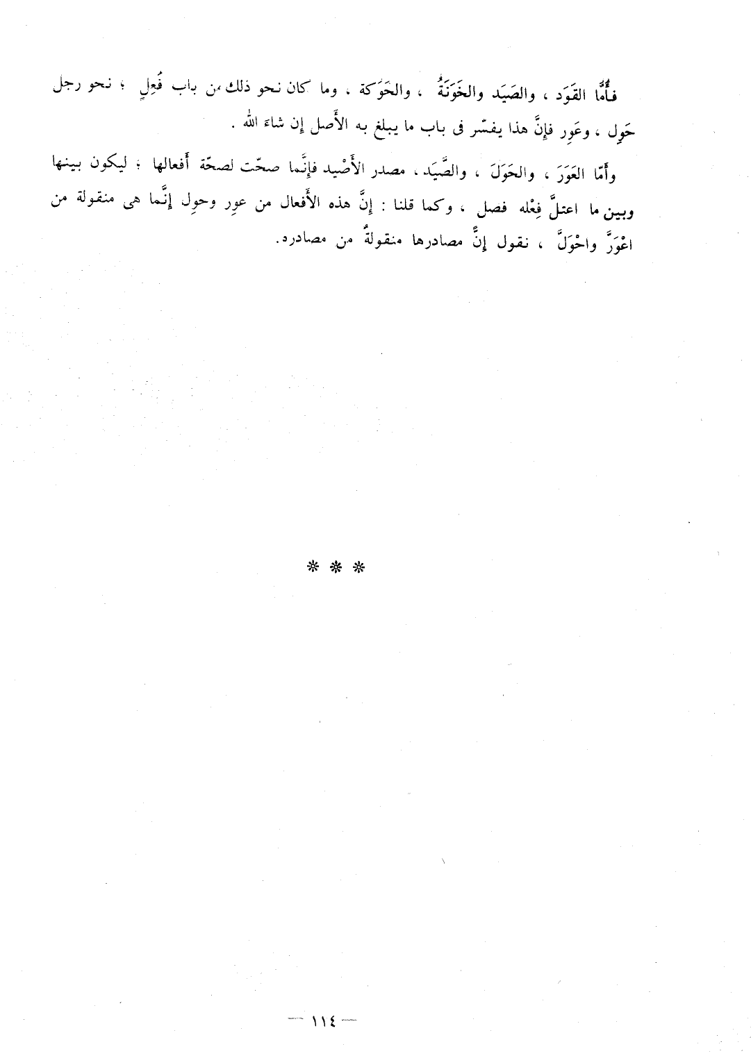 فأَمَّا القَوَد والصَيَد والخَوَنَةُ والحَوَكة وَمَا كَانَ نَحْو ذَلِك من بَاب فُعِلٍ نَحْو رجل حَوِل وعَوِر فإِنَّ هَذَا يفسّر فِي بَاب مَا يبلغ بِهِ الأَصل إِن شاءَ الله وأَمَّا العَوَرَ والحَوَلَ والصَّيَد مصدر الأَصْد فإِنَّما صحّت لصحّة أَفعالها ليَكُون بَينهَا وَبَين مَا اعتلَّ فِعْله فصل وكما قُلْنَا إِنَّ هَذِه الأَفعال من عوِر وحوِل إِنَّما هِيَ منقولة من أَعْوَرَّ واحْوَلَّ نقُول إِنَّ مصادرها منقولةٌ من مصادره
