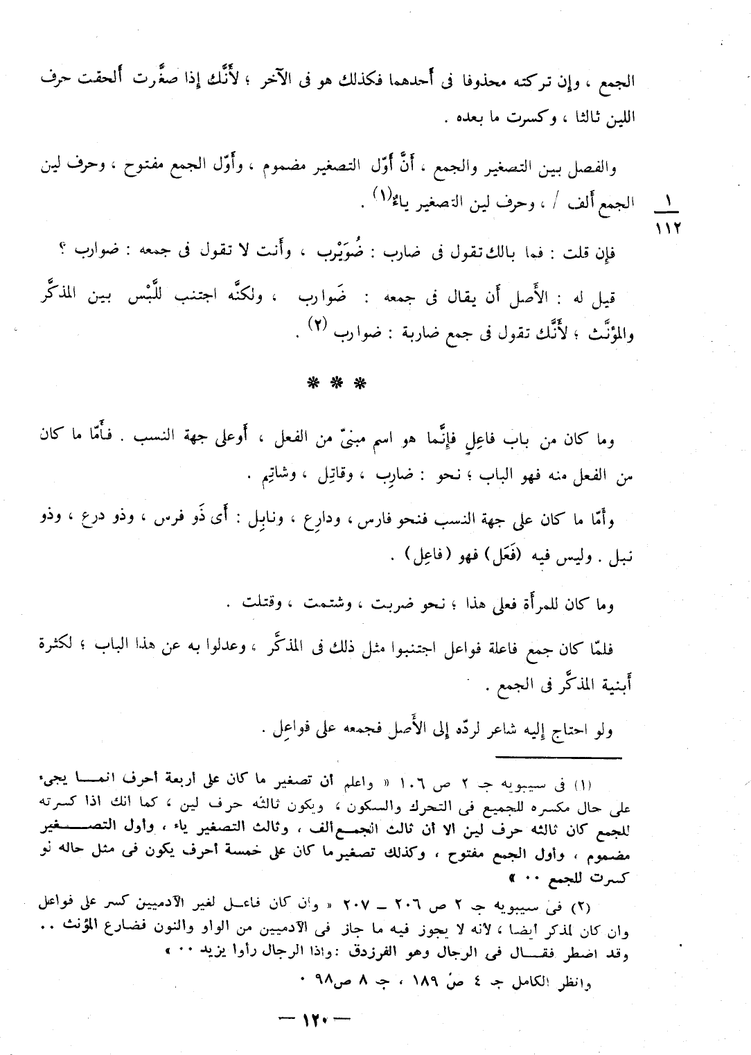 الْجمع وان تركته محذوفا فى أَحدهمَا فَكَذَلِك هُوَ فى الْأُخَر لِأَنَّك إِذا صغرت ألحقت حرف اللين ثَالِثا وَكسرت مَا بعده والفصل بَين التصغير وَالْجمع أَن أول التصغير مضموم وَأول الْجمع مَفْتُوح وحرف لين الْجمع أَلف / وحرف لين التصغير ياءٌ فإِن قلت فَمَا بالك تَقول فِي ضَارب ضُوَيْرب وأَنت لَا تَقول فِي جمعه ضوارب قيل لَهُ الأَصل أَن يُقَال فِي جمعه ضَوارب ولكنَّه اجْتنب للَّبس بَين المذكَّر والمؤَنَّث لأَنَّك تَقول فِي جمع ضاربة ضوارب وَمَا كَانَ من بَاب فاعِلٍ فإِنَّما هُوَ اسْم مبنّي من الْفِعْل أَو على جِهَة النّسَب فأَمَّا مَا كَانَ من الْفِعْل مِنْهُ فَهُوَ الْبَاب نَحْو ضارِب وقاتِل وشاتِم وأَمّا مَا كَانَ على جِهَة النّسَب فنحو فَارس ودارِع ونابِل أَي ذَو فرس وَذُو درع وَذُو نبل وَلَيْسَ فِيهِ (فَعَل) فَهُوَ (فاعِل) وَمَا كَانَ للمرأَة فعلى هَذَا نَحْو ضربت وشتمت وَقتلت فلمّا كَانَ جمع فاعلة فواعل اجتنبوا مثل ذَلِك فِي المذكَّر وَعدلُوا بِهِ عَن هَذَا الْبَاب لِكَثْرَة أَبنية المذكَّر فِي الْجمع وَلَو احْتَاجَ إِليه شَاعِر لردَّه إِلى الأَصل فَجَمعه على فواعِل