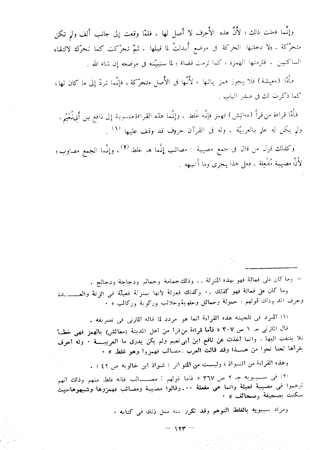 وإِنمَّا فعلت ذَلِك لأَنَّ هَذِه الأَحرف لَا أَصل لَهَا فلمّا وَقعت إِلى جَانب أَلف وَلم تكن متحرّكة وَلَا دَخَلتهَا الْحَرَكَة فِي مَوضِع أُبدلتْ لما قبلهَا ثمّ تحرّكت كَمَا تحرّك لالتقاء الساكنين فلزمتها الْهمزَة كَمَا لَزِمت قَضَاء لما سنبيّنه فِي مَوْضِعه إِن شاءَ الله فأَمَّا (معيشة) فَلَا يجوز همز يائها لأَنَّها من الأَصل متحرّكة فإِنَّما تردّ إِلى مَا كَانَ لَهَا كَمَا ذكرت لَك فِي صدر الْبَاب فأَمّا قراءَة من قرأَ (معائِش) فهمز فإِنَّه غَلط وإِنَّما هَذِه القراءَة منسوبة إِلى نَافِع بن أَبي نُعَيْم وَلم يكن لَهُ علم بِالْعَرَبِيَّةِ وَله فِي الْقُرْآن حُرُوف قد وقف عَلَيْهَا وَكَذَلِكَ قَول من قَالَ فِي جمع مُصِيبَة مصائب إِنَّما هُوَ غلط وإِنَّما الْجمع مصاوب لأَنَّ مُصِيبَة مُفْعِلة فعلى هَذَا يجْرِي وَمَا أَشبهه