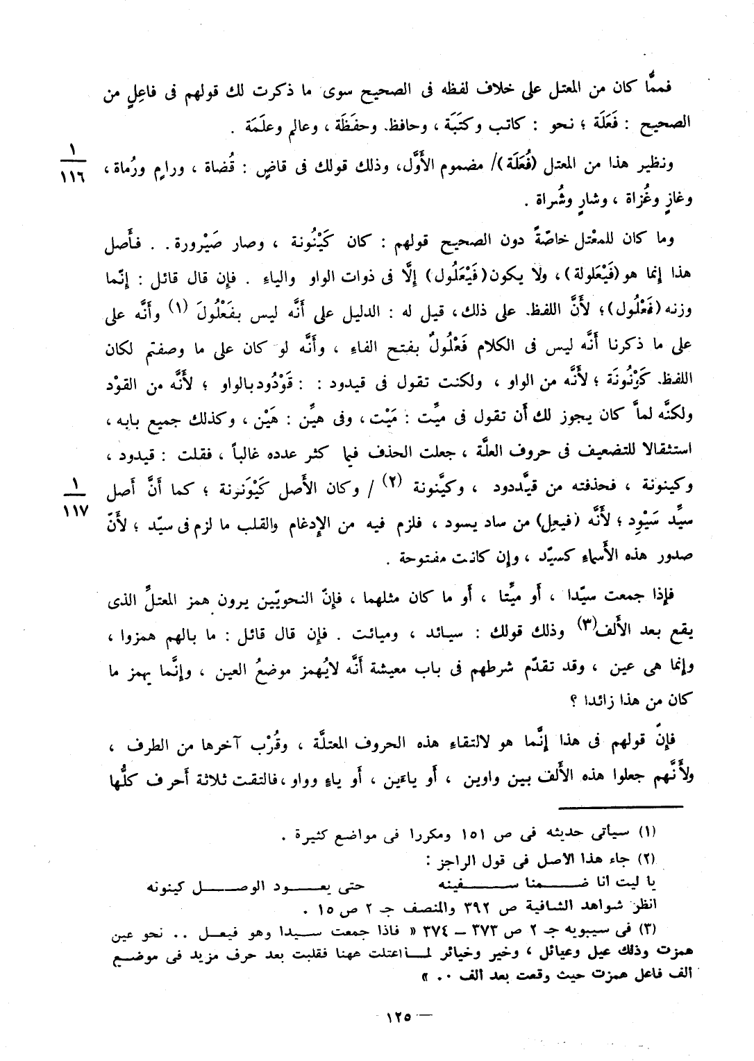 فممّا كَانَ من المعتل على خلاف لَفظه فِي الصَّحِيح سوى مَا ذكرت لَك قَوْلهم فِي فاعِلٍ من الصَّحِيح فَعَلَة نَحْو كَاتب وكتَبَة وحافظ وحفَظَة وعالم وعلَمَة وَنَظِير هَذَا من المعتل (فُعَلَة) / مضموم الأَول وَذَلِكَ قَوْلك فِي قاضٍ قُضاة ورامٍ ورُماة وغازٍ وغُزاة وشارٍ وشُراة وَمَا كَانَ للمعْتل خاصّة دون الصَّحِيح قَوْلهم كَانَ كَيْنُونة وَصَارَ صَيْرورة فأَصل هَذَا إِنما هُوَ (فَيْعَلولة) وَلَا يكون (فَيْعَلُول) إِلاَّ فِي ذَوَات الواووالياءِ فإِن قَالَ قَائِل إِنَّما وَزنه (فَعْلُول) لأَنَّ اللَّفْظ على ذَلِك قيل لَهُ الدَّلِيل على أَنَّه لَيْسَ بفَعْلُول وأَنَّه على مَا ذكرنَا أَنَّه لَيْسَ فِي الْكَلَام فَعْلُولٌ بفنح الفاءِ وأَنَّه لَو كَانَ على مَا وصفتم لَكَانَ اللَّفْظ كَوْنُونَة لأَنَّه من الْوَاو ولكنت تَقول فِي قيدود قَوْدُود بِالْوَاو لأَنَّه من القوْد ولكنَّه لمَّا كَانَ يجوز لَك أَن تَقول فِي ميِّت مَيْت وَفِي هيِّن هَيْن وَكَذَلِكَ جَمِيع بَابه استثقالا للتضعيف فِي حُرُوف العلَّة جعلت الْحَذف فِيمَا كثر عدده غَالِبا فَقلت قيدود وكينونة فحذفته من قيَّددود وكيَّنونة / وَكَانَ الأَصل كَيْونَونة كَمَا أَنَّ أَصل سيِّد سَيْوِد لأَنَّه (فيعِل) من سَاد يسود فَلَزِمَ فِيهِ من الإِدغام وَالْقلب مَا لزم فِي سيّد لأَنَّ صُدُور هَذِه الأَسماء كسيّد وإِن كَانَت مَفْتُوحَة فإِذا جمعت سيّدا أَو ميِّتا أَو مَا كَانَ مثلهمَا فإِنّ النحويّين يرَوْنَ همز المعتلِّ الَّذِي يَقع بعد الأَلف وَذَلِكَ قَوْلك سيائد وميائت فإِن قَالَ قَائِل مَا بالهم همزوا وإِنما هِيَ عين وَقد تقدّم شرطهم فِي بَاب معيشة أَنَّه لَا يُهمز موضعُ الْعين وإِنَّما يهمز مَا كَانَ من هَذَا زَائِدا فإِن قَوْلهم فِي هَذَا إِنَّما هُوَ لالتقاءِ هَذِه الْحُرُوف المعتلَّة وقُرْب آخرهَا من الطّرف ولأَنَّهم جعلُوا هَذَا الأَلف بَين واوين أَو ياءَين أَو ياءٍ وواو فالتقت ثَلَاثَة أَحرف كلُّها