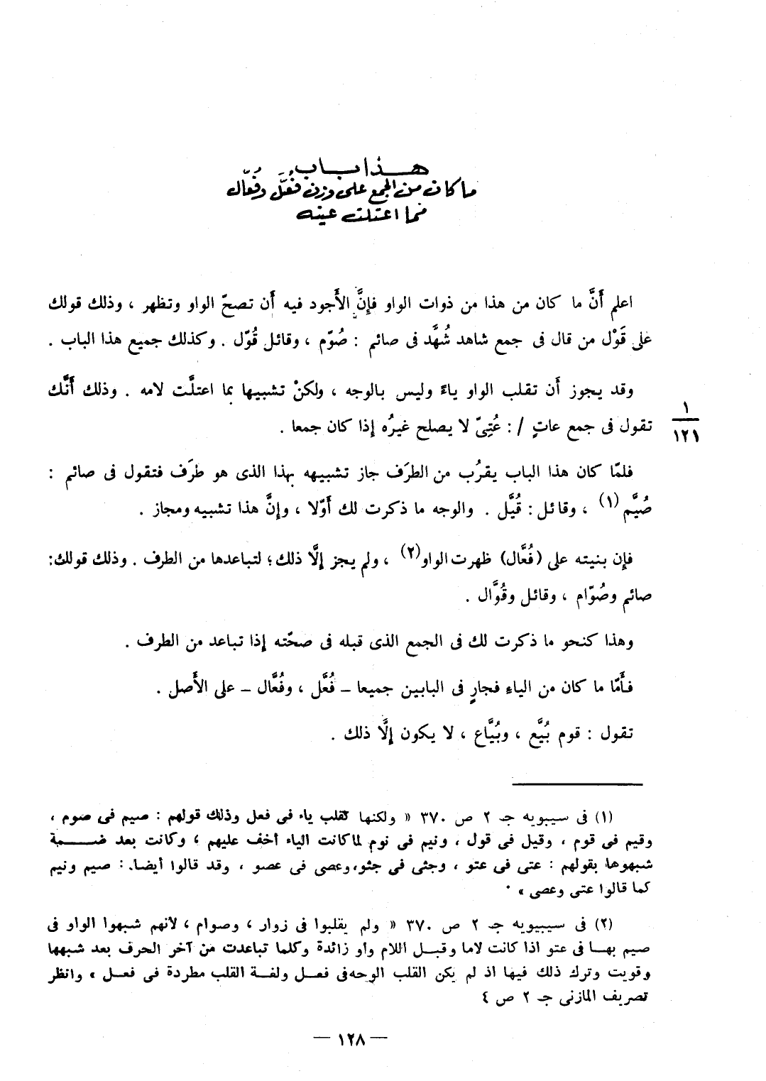 اعْلَم أَنَّ مَا كَانَ من هَذَا من ذَوَات الْوَاو فإِنَّ الأَجود فِيهِ أَن تصحّ الْوَاو وَتظهر وَذَلِكَ قَوْلك على قَوْل من قَالَ فِي جمع شَاهد شُهَّد فِي صَائِم صُوّم وَقَائِل قُوّل وَكَذَلِكَ جَمِيع هَذَا الْبَاب وَقد يجوز أَن تقلب الْوَاو يَاء وَلَيْسَ بِالْوَجْهِ ولكنْ تَشْبِيها بِمَا اعتلَّت لامه وَذَلِكَ أَنَّك تَقول فِي جمع عاتٍ / عُتِيّ لَا يصلح غيرُه إِذا كَانَ جمعا فلمّا كَانَ هَذَا الْبَاب يقرُب من الطرَف جَازَ تشبيهه بِهَذَا الَّذِي هُوَ طَرف فَتَقول فِي صَائِم صُيَّم وَقَائِل قُيَّل وَالْوَجْه مَا ذكرت لَك أَوّلا وإِنَّ هَذَا تَشْبِيه ومجاز فإِن بنيته على (فُعَّال) ظَهرت الْوَاو وَلم يجز إِلا ذَلِك لتباعدها من الطّرف وَذَلِكَ قَوْلك صَائِم وصُوّام وَقَائِل وقُوَّال وَهَذَا كنحو مَا ذكرت لَك فِي الْجمع الَّذِي قبله فِي صحّته إِذا تبَاعد من الطّرف فأَمَّا مَا كَانَ من الياءِ فجارٍ فِي الْبَابَيْنِ جَمِيعًا - فُعَّل وفُعَّال على الأَصل تَقول قوم بُيَّع وبُيَّاع لَا يكون إِلاَّ ذَلِك