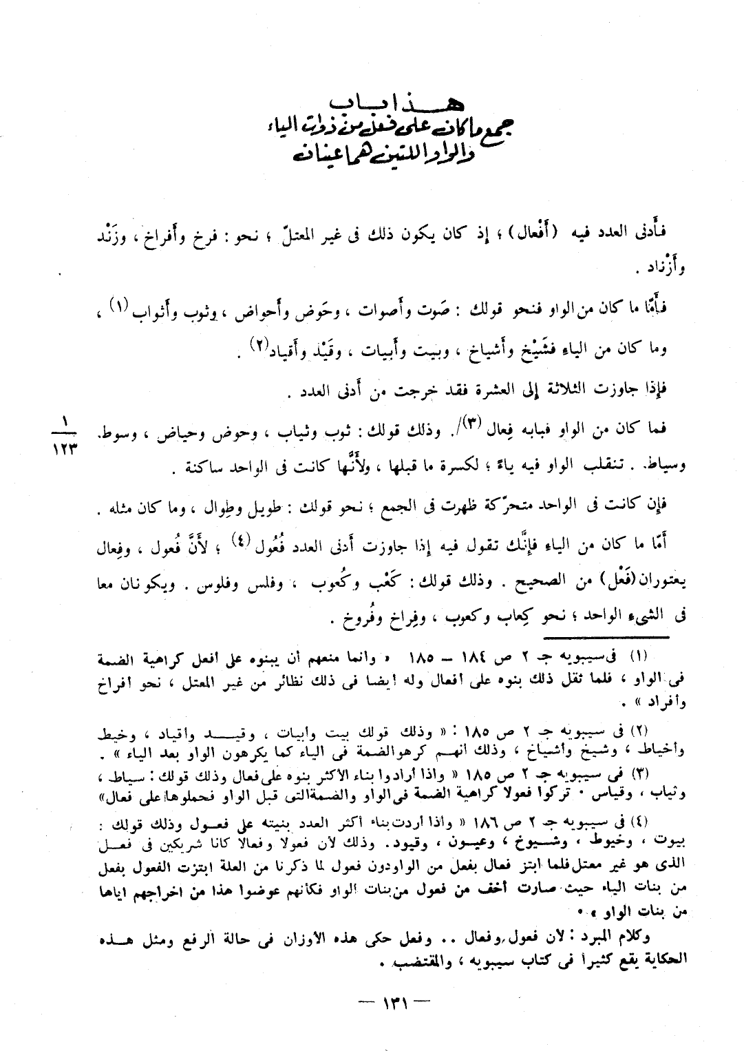 فأَدنى الْعدَد فِيهِ (أَفْعال) إِذ كَانَ يكون ذَلِك فِي غير المعتلّ نَحْو فرخ وأَفراخ وزَنْد وأَزْناد فأَمّا مَا كَانَ من الْوَاو فنحو قَوْلك صَوت وأَصوات وحَوض وأَحواض وثوب وأَثواب وَمَا كَانَ من الياءِ فشَيْخ وأَشياخ وَبَيت وأَبيات وقَيْد وأَقياد فإِذا جَاوَزت الثَّلَاثَة إِلى الْعشْرَة فقد خرجت من أَدنى الْعدَد فَمَا كَانَ من الْوَاو فبابه فِعال / وَذَلِكَ قَوْلك ثوب وَثيَاب وحوض وحياض وسوط وسياط تنْقَلب الْوَاو فِيهِ يَاء لكسرة مَا قبلهَا ولأَنَّها كَانَت فِي الْوَاحِد سَاكِنة فإِن كَانَت فِي الْوَاحِد متحرّكة ظَهرت فِي الْجمع نَحْو قَوْلك طَوِيل وطِوال وَمَا كَانَ مثله أَمّا مَا كَانَ من الياءِ فإِنَّك تَقول فِيهِ إِذا جَاوَزت أَدنى الْعدَد فُعُول لأَنَّ فُعول وفِعال يعتوران (فَعْل) من الصَّحِيح وَذَلِكَ قَوْلك كَعْب وكُعوب وفلس وفلوس ويكونان مَعًا فِي الشيءِ الْوَاحِد نَحْو كِعاب وكعوب وفِراخ وفُروخ