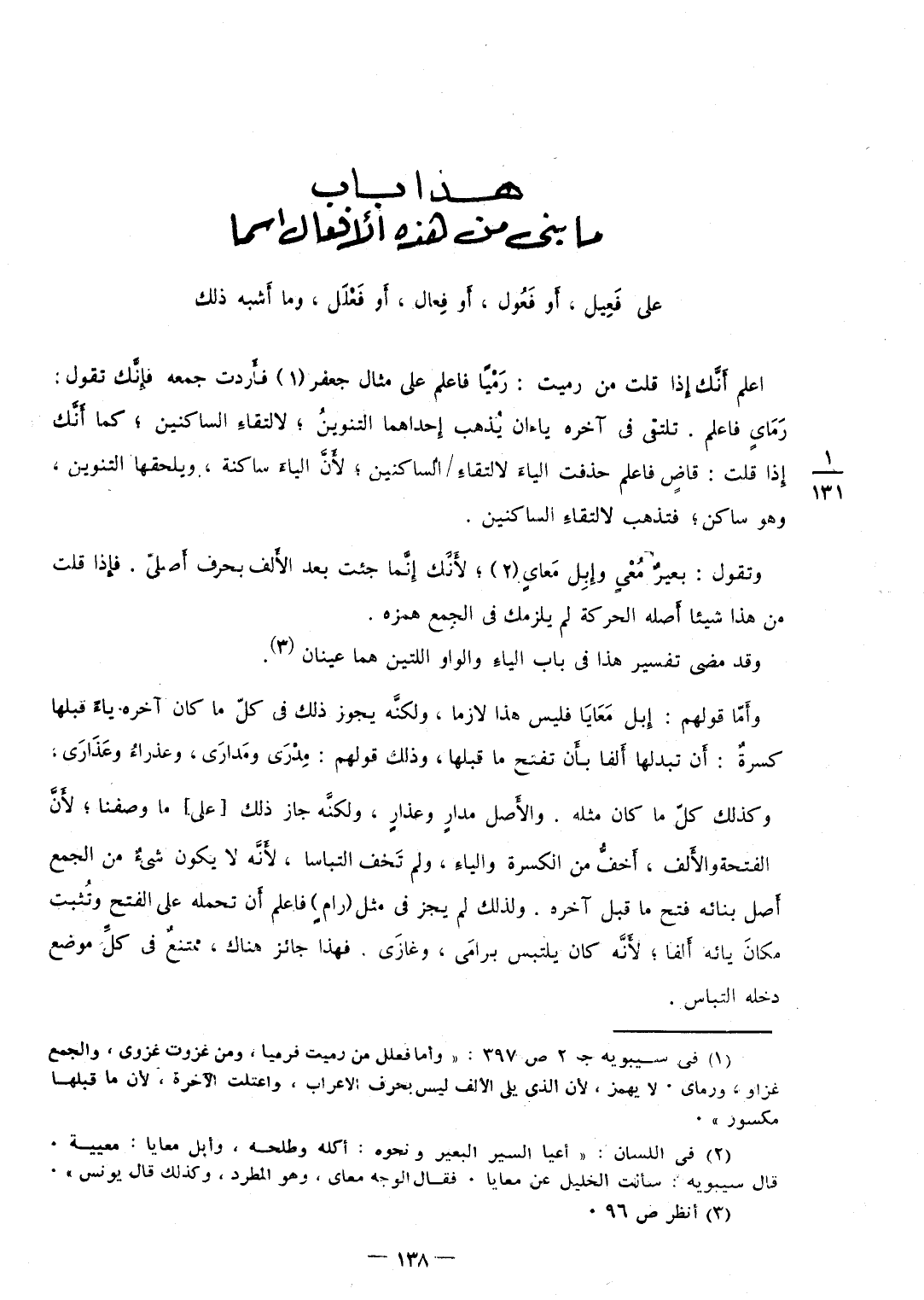 ذَلِك اعْلَم أَنَّك إِذا قلت من رميت رَمْياً فَاعْلَم على مِثَال جَعْفَر فأَردت جمعه فإِنَّك تَقول رَمَايٍ فَاعْلَم تلتقي فِي آخِره ياءان يُذهب إِحداهما التَّنْوِين لالتقاء الساكنين كَمَا أَنَّك إِذا قلت قاضٍ فَاعْلَم حذفت الياءَ لالتقاءِ / الساكنين لأَنَّ الياءَ سَاكِنة ويلحقها التَّنْوِين وَهُوَ سَاكن فتذهب لالتقاء الساكنين وَتقول بعيرٌ مُعْيٍ وإِبِل مَعايٍ لأَنَّك إِنما جِئْت بعد الأَلف بِحرف أَصليّ فإِذا قلت من هَذَا شَيْئا أَصله الْحَرَكَة لم يلزمك فِي الْجمع همزَة وَقد مضى تَفْسِير هَذَا فِي بَاب الياءِ وَالْوَاو اللَّتَيْنِ هما عينان وأَمَّا قَوْلهم إِبل مَعَايَا فَلَيْسَ هَذَا لَازِما ولكنَّه يجوز ذَلِك فِي كلّ مَا كَانَ آخِره يَاء قبلهَا كسرةٌ أَن تبدلها أَلفا بأَن تفتح مَا قبلهَا وَذَلِكَ قَوْلهم مِدرَى ومدارى وعَذراءُ وعَذَارَى وَكَذَلِكَ كلّ مَا كَانَ مثله والأَصل مدارٍ وعذارٍ ولكنًّه جَازَ ذَلِك {على} مَا وَصفنَا لأَنَّ الفتحة والأَلف أَخفُّ من الكسرة والياءِ وَلم تَخف التباسا لأَنَّه لَا يكون شيءٌ من الْجمع أَصل بنائِهِ فتح مَا قبل آخِره وَلذَلِك لم يجز فِي مثل (رامٍ) فَاعْلَم أَن تحمله على الْفَتْح وتُثبت مَكَان يائه أَلفا لأَنَّه كَانَ يلتبس برامَى وغازَى فَهَذَا جَائِز هُنَاكَ ممتنعٌ فِي كلِّ مَوضِع دخله التباس