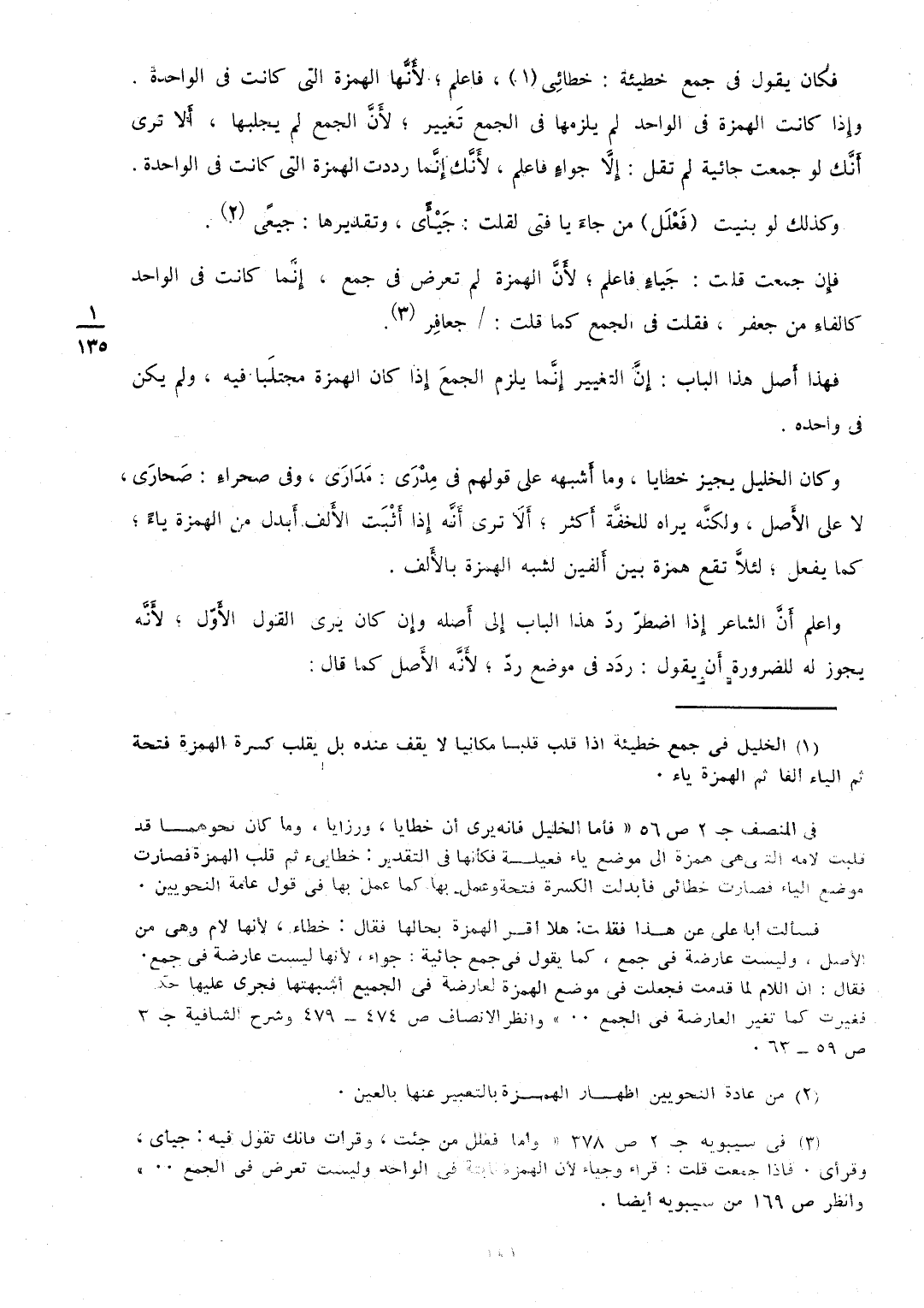 فَكَانَ يَقُول فِي جمع خَطِيئَة خطائِي فَاعْلَم لأَنَّها الْهمزَة الَّتِي كَانَت فِي الْوَاحِدَة وإِذا كَانَت الْهمزَة فِي الْوَاحِد لم يلْزمهَا فِي الْجمع تَغيير لأَنَّ الْجمع لم يجلبها أَلا ترى أَنَّك لَو جمعت جائية لم تقل إِلا جواءٍ فَاعْلَم لأَنَّك إِنَّما رددت الْهمزَة الَّتِي كَانَت فِي الْوَاحِدَة وَكَذَلِكَ لَو بنيت (فَعْلَل) من جاءَ يَا فَتى لَقلت جَيْأَي وتقديرها جيعّى فإِن جمعت قلت جَياءٍ فَاعْلَم لأَنَّ الْهمزَة لم تعرض فِي جمع إِنَّما كَانَت فِي الْوَاحِد كالفاءِ من جَعْفَر فَقلت فِي الْجمع كَمَا قلت / جعافِر فَهَذَا أَصل هَذَا الْبَاب إِنَّ التَّغْيِير إِنَّما يلْزم الْجمع إِذا كَانَ الْهمزَة مجتلَبا فِيهِ وَلم يكن فِي واحده وَكَانَ الْخَلِيل يُجِيز خَطَايَا وَمَا أَشبهه على قَوْلهم فِي مِدْرَى مَدَارَى وَفِي صحراء صَحارَى لَا على الأَصل ولكنَّه يرَاهُ للخفَّة أَكثرأَلاَ ترى أَنَّه إِذا أَثْبَت الْألف أَبدل من الْهمزَة يَاء كَمَا يفعل لئلاَّ تقع همزَة بَين أَلفين لشبه الْهمزَة بالأَلف وَاعْلَم أَنَّ الشَّاعِر إِذا اضطرّ ردّ هَذَا الْبَاب إِلى أَصله وَإِن كَانَ يرى القَوْل الأَوّل لأَنَّه يجوز لَهُ للضَّرُورَة أَن يَقُول ردَد فِي مَوضِع ردّ لاَنَّه الأَصل كَمَا قَالَ