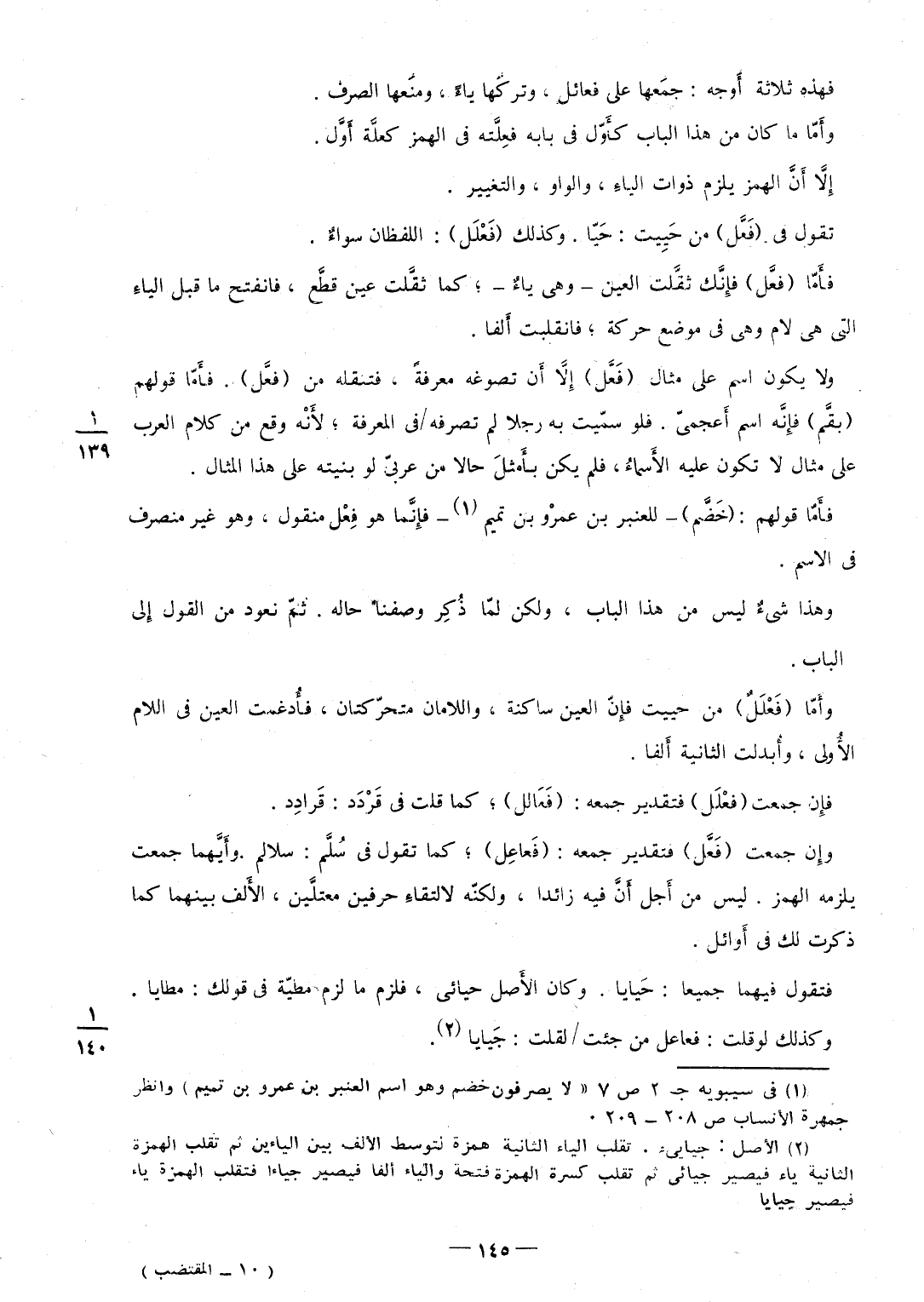 فَهَذِهِ ثَلَاثَة أَوجه جمعَها على فعائل وتركَها يَاء ومَنعها الصّرْف وأَمَّا مَا كَانَ من هَذَا الْبَاب كأَوّل فِي بَابه فعِلَّته فِي الْهَمْز كعلَّة أَوَّل إِلاَّ أَنَّ الْهَمْز يلْزم ذَوَات الياءِ وَالْوَاو والتغيير تَقول فِي (فَعَّل) من حَيِيت حَيّا وَكَذَلِكَ (فَعْلَل) اللفظان سواءٌ فأَمَّا (فعَّل) فإِنَّك ثقَّلت الْعين - وَهِي ياءٌ - كَمَا ثقَّلت عين قطَّع فانفتح مَا قبل الياءِ الَّتِي هِيَ لَام وَهِي فِي مَوضِع حَرَكَة فَانْقَلَبت أَلفا وَلَا يكون اسْم على مِثَال (فَعَّل) إِلاَّ أَن تصوغه معرفةٌ فتنقله من (فعَّل) فأمّا قَوْلهم (بقَّم) فإِنَّه اسْم أَعجميّ فَلَو سمّيت بِهِ رجلا لم تصرفه / فِي الْمعرفَة لأَنْه وَقع من كَلَام الْعَرَب على مِثَال لَا تكون عَلَيْهِ الأَسماءُ فَلم يكن بأَمثلَ حَالا من عربيّ لَو بنيته على هَذَا الْمِثَال فأَمَّا قَوْلهم (خَضَّم) - للعنبر بن عمرْو بن تَمِيم - فإِنَّما هُوَ فِعْل مَنْقُول وَهُوَ غير منصرف فِي الِاسْم وَهَذَا شيءٌ لَيْسَ من هَذَا الْبَاب وَلَكِن لمّا ذُكِر وَصفنَا حَاله ثمّ نعود من القَوْل إِلَى الْبَاب وأَمّا (فَعْلَلٌ) من حييت فإِنّ الْعين سَاكِنة واللامان متحرّكتان فأُدغمت الْعين فِي اللَّام الأُولى وأُبدلت الثَّانِيَة أَلفا فإِن جمعت (فعْلَل) فتقديرجمعه (فَعَالل) كَمَا قلت فِي قَرْدَد قَرادِد وإِن جمعت (فَعَّل) فتقدير جمعه (فَعاعِل) كَمَا تَقول فِي سُلَّم سلالم وأَيَّهما جمعت يلْزمه الْهَمْز لَيْسَ من أَجل أَنَّ فِيهِ زَائِدا ولكنَّه لالتقاءِ حرفين معتلَّين الأَلف بَينهمَا كَمَا ذكرت لَك فِي أَوائل فَتَقول فيهمَا جَمِيعًا حَيايا وَكَانَ الأَصل حيائي فَلَزِمَ مَا لزم مطيّة فِي قَوْلك مطايا وَكَذَلِكَ لَو قلت فعاعل من جِئْت / لَقلت جَيايا
