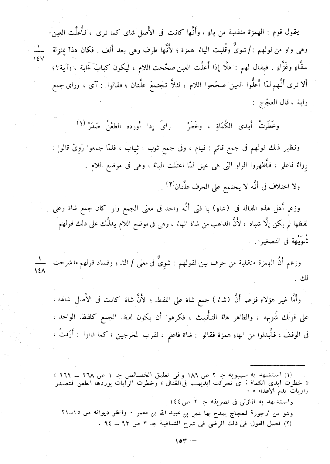 وَنَظِير ذَلِك قَوْلهم فِي جمع قَائِم قيام وَفِي جمع ثوب ثِياب فلمّا جمعُوا رَوِيّ قَالُوا رِواءٌ فَاعْلَم فأَظهروا الْوَاو الَّتِي هِيَ عين لمّا اعتلت الياءُ وَهِي فِي مَوضِع اللَّام وَلَا اخْتِلَاف فِي أَنَّه لَا يجْتَمع على الْحَرْف علَّتان وَزعم أَهل هَذِه الْمقَالة فِي (شاءٍ) يَا فَتى أَنَّه وَاحِد فِي معنى الْجمع وَلَو كَانَ جمع شَاة وعَلى لَفظهَا لم يكن إِلاَّ شِيَاه لأَنَّ الذَّاهِب من شَاة الهاءُ وَهِي فِي مَوضِع اللَّام يدلَّك على ذَلِك قَوْلهم شُوَيْهة فِي التصغير وَزعم أَنَّ الْهمزَة منقلبة من حرف لين لقَولهم شوِيٌّ فِي الْمَعْنى / الشاءِ وَفَسَاد قَوْلهم مَا شرحت لَك وأَمَّا غير هؤلاءِ فَزعم أَنَّ (شاءُ) جمع شَاة على اللَّفْظ لأَنَّ شَاة كَانَت فِي الأَصل شاهة على قَوْلك شُويهة وَالظَّاهِر هاءُ التأْنيث فكرهوا أَن يكون لفظ الْجمع كَلَفْظِ الْوَاحِد فِي الْوَقْف فأَبدلوا من الهاءِ همزَة فَقَالُوا شَاءَ فَاعْلَم لقرب المخرجين كَمَا قَالُوا أَرَقتُ