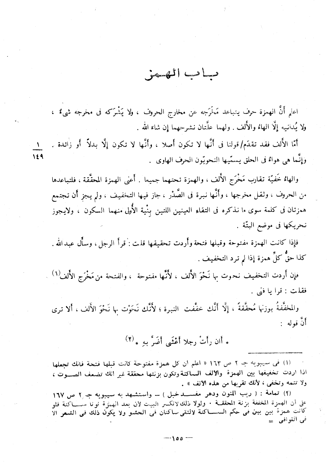 اعْلَم أَنَّ الْهمزَة حرف يتباعد مَخْرَجه عَن مخارج الْحُرُوف وَلَا يَشْرَكه فِي مخرجه شيءٌ وَلَا يُدانيه إِلاَّ الهاءُ والأَلف وَلَهُمَا علَّتان نشرحهما إِن شاءَ الله أَمَّا الأَلف فقد تقدم / قَوْلنَا فِي أَنَّها لَا تكون أَصلا وأَنَّها لَا تكون إِلاَّ بَدَلا أَو زَائِدَة وإِنَّما هِيَ هواءٌ فِي الْحلق يسمّيها النحويّون الْحَرْف الهاوي والهاءُ خَفيّة تقَارب مَخْرَج الأَلف والهمزة تحتهما جَمِيعًا أَعني الْهمزَة المحقَّقة فلتباعدها من الْحُرُوف وَثقل مخرجها وأَنَّها نبرة فِي الصَّدْر جَازَ فِيهَا التَّخْفِيف وَلم يجز أَن تَجْتَمِع همزتان فِي كلمة سوى مَا نذكرهُ فِي التقاءِ الْعَينَيْنِ اللَّتَيْنِ بِنْية الأُولى مِنْهُمَا السّكُون وَلَا يجوز تحريكها فِي مَوضِع البتّة فإِذا كَانَت الْهمزَة مَفْتُوحَة وَقبلهَا فَتْحة وأَردت تحقيقها قلت قرأَ الرجل وسأَل عبد الله كَذَا حقُّ كلِّ همزَة إِذا لم ترد التَّخْفِيف فإِن أَردت التَّخْفِيف نحوت بهَا نَحْوَ الأَلف لأَنَّها مَفْتُوحَة والفتحة من مَخْرَج الأَلف فَقلت قرا يَا فَتى والمخفَّفة بوزنها مُحقَّقةً إِلاَّ أَنَّك خفَّفت النبرة لأَنَّك نَحَوْت بهَا نَحْوَ الأَلف أَلا ترى أَنَّ قَوْله