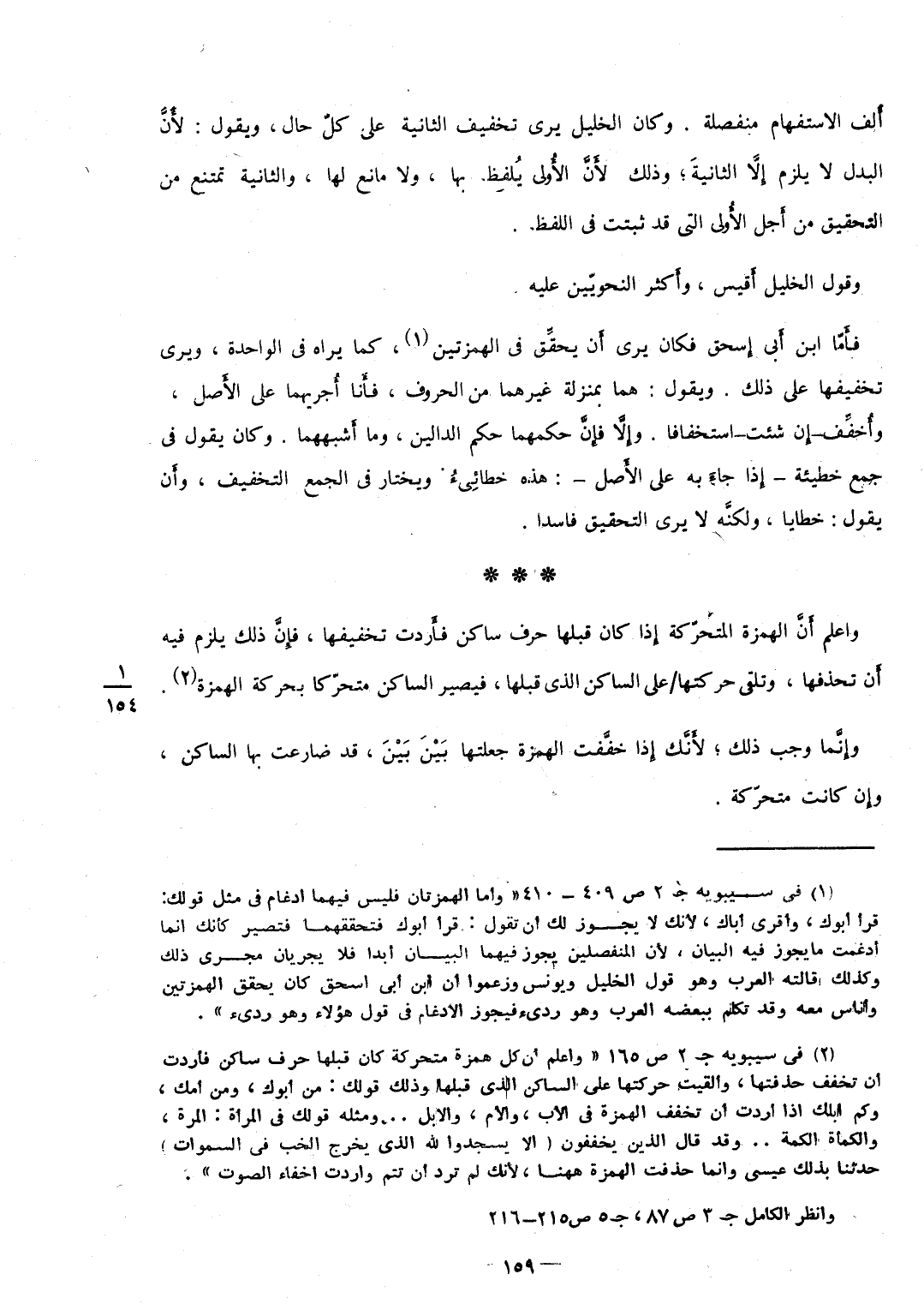أَلف الِاسْتِفْهَام مُنْفَصِلَة وَكَانَ الْخَلِيل يرى تَخْفيف الثَّانِيَة على كلّ حَال وَيَقُول لأَنَّ الْبَدَل لَا يلْزم إِلاَّ الثانيةَ وَذَلِكَ لأَنَّ الأُولى يُلفظ بهَا وَلَا مَانع لَهَا وَالثَّانيَِة تمْتَنع من التَّحْقِيق من أَجل الأُولى الَّتِي قد ثبتَتْ فِي اللَّفْظ وَقَول الْخَلِيل أَقيس وأَكثر النحويّين عَلَيْهِ فأَمَّا ابْن أَبي إِسحق فَكَانَ يرى أَن يحقِّق فِي الهمزتين كَمَا يرَاهُ فِي الْوَاحِدَة وَيرى تخفيفها على ذَلِك وَيَقُول هما بِمَنْزِلَة غَيرهمَا من الْحُرُوف فأَنا أُجريهما على الأَصل وأُخفِّف - إِن شِئْت - اسْتِخْفَافًا وإِلاَّ فإِنَّ حكمهمَا حكم الدالين وَمَا أَشبههما وَكَانَ يَقُول فِي جمع خَطِيئَة - إِذا جاءَ بِهِ على الأَصل - هَذِه خطائِيءُ ويختار فِي الْجمع التَّخْفِيف وإِن يَقُول خَطَايَا ولكنَّه لَا يرى التَّحْقِيق فَاسِدا وَاعْلَم أَنَّ الْهمزَة المتحرّكة إِذا كَانَ قبلهَا حرف سَاكن فأَردت تخفيفها فإِنَّ ذَلِك يلْزم فِيهِ أَن تحذفها وتلقى حركتها / على السَّاكِن الَّذِي قبلهَا فَيصير السَّاكِن متحرّكا بحركة الْهمزَة وإِنَّما وَجب ذَلِك لأَنَّك إِذا خففت الْهمزَة جَعلتهَا بَيْنَ بَيْنَ قد ضارعت بهَا السَّاكِن وإِن كَانَت متحرّكة