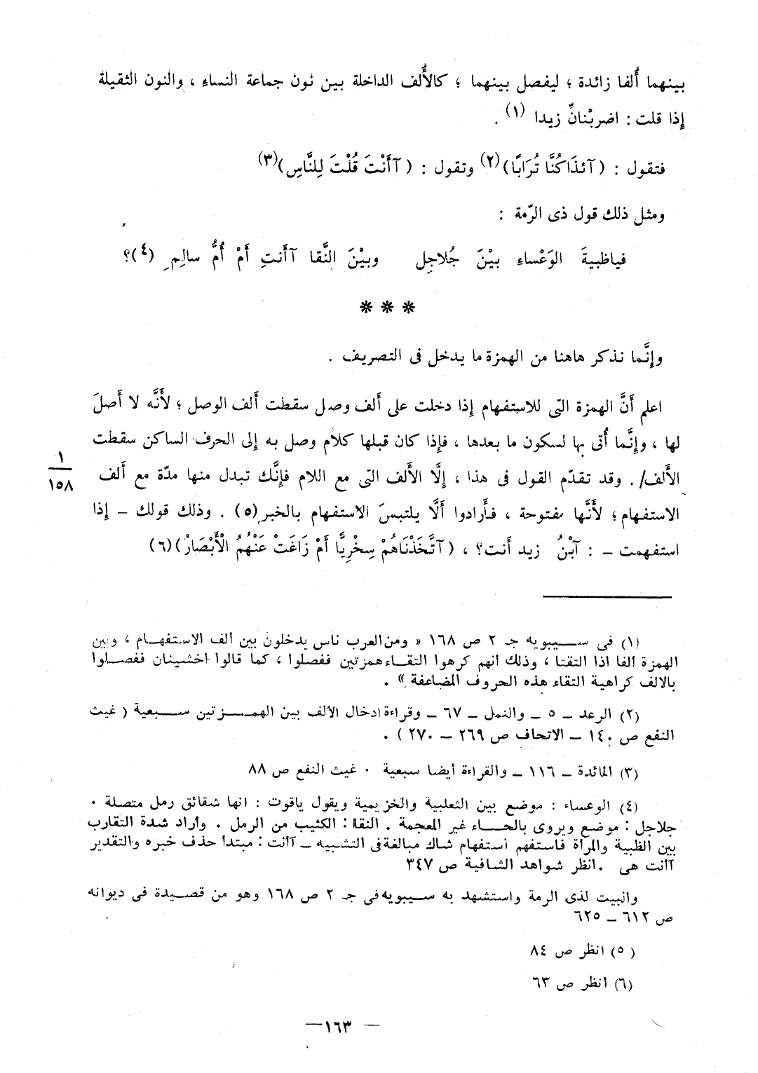 وإِنَّما نذْكر هَاهُنَا من الْهمزَة مَا يدْخل فِي التصريف اعْلَم أَنَّ الْهمزَة الَّتِي للاستفهام إِذا دخلت على أَلف وصل سَقَطت أَلف الْوَصْل لأَنَّه لَا أَصلَ لَهَا وإِنَّما أُتي بهَا لسكون مَا بعْدهَا فإِذا كَانَ قبلهَا كَلَام وصل بِهِ إِلى الْحَرْف السَّاكِن سَقَطت الأَلف / وَقد تقدم القَوْل فِي هَذَا إِلاَّ الأَلف الَّتِي مَعَ اللَّام فإِنَّك تبدل مِنْهَا مدّة مَعَ أَلف الِاسْتِفْهَام لأَنَّها مَفْتُوحَة فأَرادوا أَلاَّ يلتبس الِاسْتِفْهَام بالْخبر وَذَلِكَ قَوْلك - إِذا استفهمت - آبْنُ زيد أَنت {آتَّخَذْنَاهُمْ سِخْرِيَّا أَم زَاغَتْ عَنْهُمُ الأَيْصَارُ}