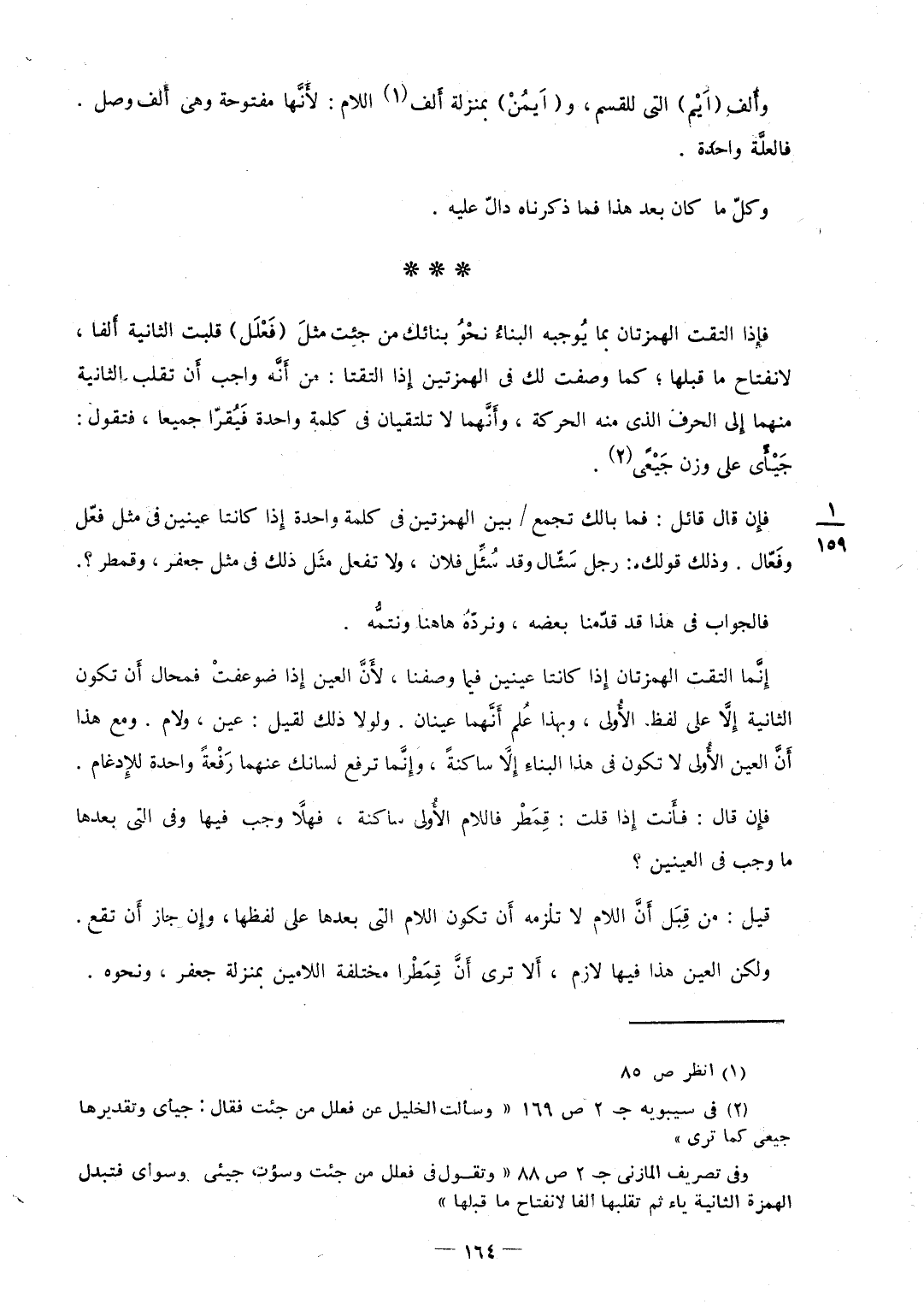 وأَلف (آيْم) الَّتِي للقسم و (اَيمُنْ) بِمَنْزِلَة أَلف اللَّام لأَنَّها مَفْتُوحَة وَهِي أَلف وصل فالعلَّة وَاحِدَة وكلّ مَا كَانَ بعد هَذَا فَمَا ذَكرْنَاهُ دالّ عَلَيْهِ فإِذا الْتَقت الهمزتان بِمَا يُوجبه البناءُ نحْوُ بنائك من جئِت مثلَ (فَعْلَل) قلبت الثَّانِيَة أَلفا لانفتاح مَا قبلهَا كَمَا وصفت لَك فِي الهمزتين إِذا التقتا من أَنَّه وَاجِب أَن تقلب الثَّانِيَة مِنْهُمَا إِلى الْحَرْف الَّذِي مِنْهُ الْحَرَكَة وأَنَّهما لَا يَلْتَقِيَانِ فِي كلمة وَاحِدَة فَيُقرّا جَمِيعًا فَتَقول جَيْأَي على وزن جَيْعىً فإِن قَالَ قَائِل فَمَا بالك تجمع / بَين الهمزتين فِي كلمة وَاحِدَة إِذا كَانَتَا عينين فِي مثل فعّل وفَعّال وَذَلِكَ قَوْلك رجل سَئّال وَقد سُئِّل فلَان وَلَا تفعل مثَل ذَلِك فِي مثل جَعْفَر وقمطر فَالْجَوَاب فِي هَذَا قد قدّمنا بعضه ونردّهُ هَاهُنَا ونتمُّه إِنَّما الْتَقت الهمزتان إِذا كَانَتَا عينين فِيمَا وَصفنَا لأَنَّ الْعين إِذا ضوعفت فمحال أَن تكون الثَّانِيَة إِلاَّ على لفظ الأُولى وَبِهَذَا عُلم أَنَّهما عينان وَلَوْلَا ذَلِك لقيل عين وَلَام وَمَعَ هَذَا أَنَّ الْعين الأُولى لَا تكون فِي هَذَا البناءِ إِلاَّ سَاكِنة وإِنَّما ترفع لسَانك عَنْهُمَا رَفْعةً وَاحِدَة للإِدغام فإِن قَالَ فأَنت إِذا قلت قِمَطْر فَاللَّام الأُولى سَاكِنة فهلاَّ وَجب فِيهَا وَفِي الَّتِي بعْدهَا مَا وَجب فِي الْعَينَيْنِ قيل من قِبَل أَنَّ اللَّام لَا تلْزمهُ أَن تكون اللَّام الَّتِي بعْدهَا على لَفظهَا وإِن جَازَ أَن تقع وَلَكِن الْعين هَذَا فِيهَا لَازم أَلا ترى أَنَّ قِمَطْرا مُخْتَلفَة اللامين بِمَنْزِلَة جَعْفَر وَنَحْوه