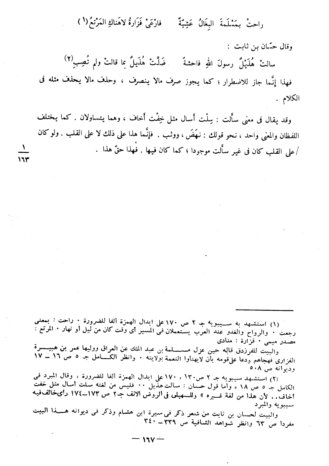فَهَذَا إِنَّما جَازَ للاضطرار كَمَا يجوز صرف مَا لَا ينْصَرف وَحذف مَالا يحذف مثله فِي الْكَلَام وَقد يُقَال فِي معنى سأَلت سِلْت أَسال مثل خِفْت أَخاف وهما يتساولان كَمَا يخْتَلف اللفظان وَالْمعْنَى وَاحِد نَحْو قَوْلك نَهَض ووثب فإِنَّما هَذَا على ذَلِك لَا على الْقلب وَلَو كَانَ / على الْقلب كَانَ فِي غير سأَلت مَوْجُودا كَمَا كَانَ فِيهَا فَهذا حقّ هَذَا