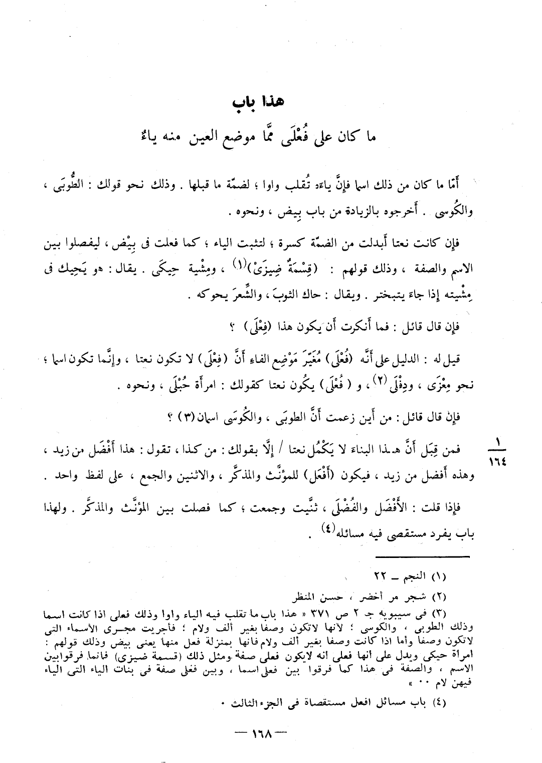 أَمّا مَا كَانَ من ذَلِك اسْما فإِنَّ ياءَه تُقلب واوا لضمّة مَا قبلهَا وَذَلِكَ نَحْو قَوْلك الطُّوبَى والكُوسى أَخرجوه بِالزِّيَادَةِ من بَاب بِيض وَنَحْوه فإِن كَانَت نعتا أَبدلت من الضمّة كسرة لتثبت الْيَاء كَمَا فعلت فِي بِيْض ليفصلوا بَين الِاسْم وَالصّفة وَذَلِكَ قَوْلهم {قسْمَة ضيزى} ومِشْية حِيكَى يُقَال هُوَ يَحِيك فِي مِشْيته إِذا جَاءَ يتبختر وَيُقَال حاك الثوبَ والشِّعرَ يحوكه فإِن قَالَ قَائِل فَمَا أَنكرت أَن يكون هَذَا (فِعْلَى) قيل لَهُ الدَّلِيل على أَنَّه (فُعْلَى) مُغَيَّرَ مَوْضِع الفاءِ أَنَّ (فِعْلَى) لَا تكون نعتا وإِنَّما تكون اسْما نَحْو مِعْزَى ودِفْلَى و (فُعْلَى) يكُون نعتا كَقَوْلِك امرأَة حُبْلَى وَنَحْوه فإِن قَالَ قَائِل من أَين زعمت أَنَّ الطوبَى والكُوسَى اسمان فَمن قِبَل أَنَّ هَذَا البناءَ لَا يَكْمُل نعتا / إِلاَّ بِقَوْلِك من كَذَا تَقول هَذَا أَفْضَل من زيد وَهَذِه أَفضل من زيد فَيكون (أَفْعَل) للمؤنث والمذكَّر والاثنين وَالْجمع على لفظ وَاحِد فإِذا قلت الأَفْضَل والفُضْاَى ثنَّيت وجمعت كَمَا فصلت بَين المؤنَّث والمذكَّر وَلِهَذَا بَاب يفرد مستقصى فِيهِ مسَائِله