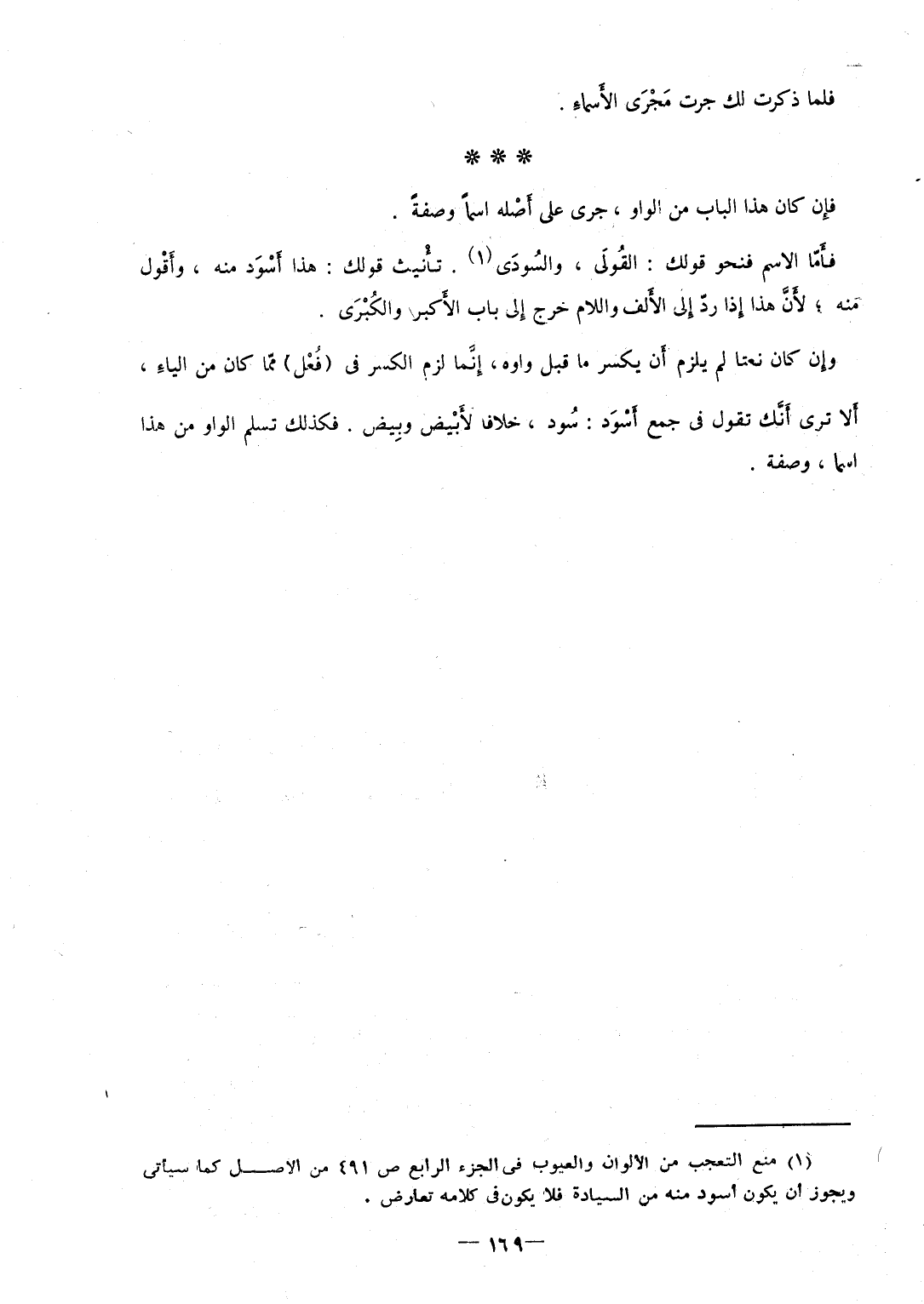 فَلَمَّا ذكرت لَك جرت مَجْرَى الأَسماءِ فَإِن كَانَ هَذَا الْبَاب من الْوَاو جرى على أَصْله اسْما وَصفَة فأَمّا الِاسْم فنحو قَوْلك والقُولَي والسُودَى تأْنيث قَوْلك هَذَا أَسْوَد مِنْهُ وأَقْول مِنْهُ لأَنَّ هَذَا إِذا ردّ إِلى الأَلف وَاللَّام خرج إِلى بَاب الأَكبر والكُبْرَى وإِن كَانَ نعتا لم يلْزم أَن يكسر مَا قبل واوه إِنَّما لزم الْكسر فِي (فُعْل) ممّا كَانَ من الياءِ أَلا ترى أَنَّك تَقول فِي جمع أَسْوَد سُود خلافًا لأَبْيض وبِيض فَكَذَلِك تسلم الْوَاو من هَذَا اسْما وَصفَة