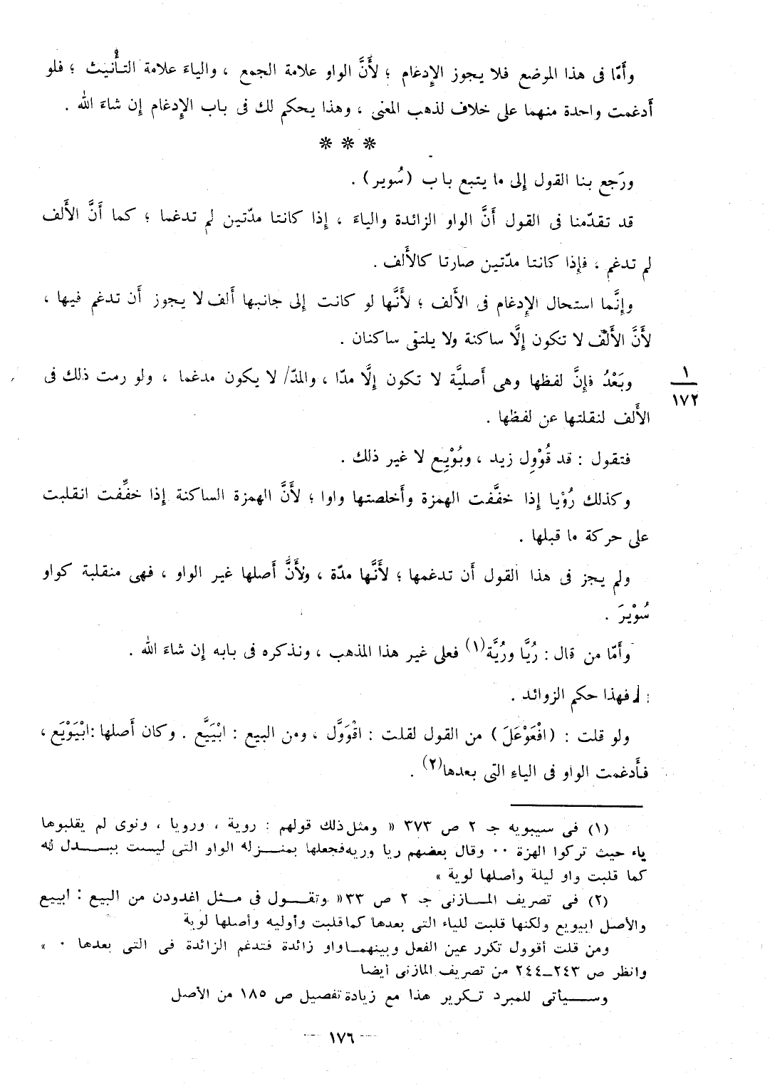 وأَمّا فِي هَذَا الْموضع فَلَا يجوز الإِدغام لأَنَّ الْوَاو عَلامَة الْجمع والياءَ عَلامَة التأْنيث فَلَو أَدغمت وَاحِدَة مِنْهُمَا على خلاف لذهب الْمَعْنى وَهَذَا يحكم لَك فِي بَاب الإِدغام إِن شاءَ الله ورَجع بِنَا القَوْل إِلى مَا يتبع بَاب (سُوير) قد تقدّمنا فِي القَوْل أَنَّ الْوَاو الزَّائِدَة والياءَ إِذا كَانَتَا مدّتين لم تدغما كَمَا أَنَّ الأَلف لم تُدْغَم فإِذا كَانَتَا مدّتين صارتا كالأَلف وإِنَّما اسْتَحَالَ الإِدغام فِي الأَلف لأَنَّها لَو كَانَت إِلى جَانبهَا أَلف لَا يجوز أَن تُدْغَم فِيهَا لأَنَّ الأَلف لَا تكون إِلاَّ سَاكِنة وَلَا يلتقي ساكنان وبَعْدُ فإِن لَفظهَا وَهِي أَصليَّة لَا تكون إِلاَّ مدّا والمدّ / لَا يكون مدغما وَلَو رمت ذَلِك فِي الأَلف لنقلتها عَن لَفظهَا فَتَقول قد قُوْوِل زيد وبُويِع لَا غير ذَلِك وَكَذَلِكَ رُؤيا إِذا خفَّفت الْهمزَة وأَخلصتها واوا لأَنَّ الْهمزَة الساكنة إِذا خفِّفت انقلبت على حَرَكَة مَا قبلهَا وَلم يجز فِي هَذَا القَوْل أَن تدغمها لأَنَّها مدّة ولأَنَّ أَصلها غير الْوَاو فَهِيَ منقلبة كواو سُوْيَر وأَمّا من قَالَ رُيَّا ورُيَّة فعلى غير هَذَا الْمَذْهَب ونذكره فِي بَابه إِن شاءَ الله فَهَذَا حكم الزَّوَائِد وَلَو قلت (افْعَوْعَلَ) من القَوْل لَقلت اْقوَوَّل وَمن البيع ابْيَيَّع وَكَانَ أَصلها ابْيَوْيَع فأَدغمت الْوَاو فِي الياءِ الَّتِي بعْدهَا