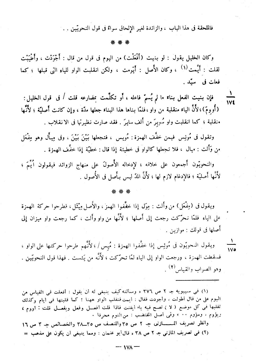 فالملحقة فِي هَذَا الْبَاب والزائدة لغير الإِلحاق سواءٌ فِي قَول النحويّين وَكَانَ الْخَلِيل يَقُول لَو بنيت (أَفْعَلْت) من الْيَوْم فِي قَول من قَالَ أَجْوَدْت وأَطْيَبْت لَقلت أَيَّمت وَكَانَ الأَصل أَيْومت وَلَكِن انقلبت الْوَاو للياءِ الَّتِي قبلهَا كَمَا فعلت فِي سيّد فإِن بنيت الْفِعْل بِنَاء لم يُسمّ فَاعله أَو تكلَّمت بمضارعه قلت / فِي قَول الْخَلِيل (أُوِومَ) لأَنَّ الياءَ منقلبة من وَاو فلمّا بناها هَذَا البناءَ جعلهَا مدّة وإِن كَانَت أَصليّة لأَنَّها منقلبة كَمَا انقلبت وَاو سُويِرَ من أَلف سايرَ فقد صَارَت نظيرتها فِي الانقلاب وَتقول فِي مُوئِس فِيمَن خفَّف الْهمزَة مُويس فتجعلها بَيْنَ بَيْنَ وَفِي مِيأَل وَهُوَ مِفْعَل من وَأَلت ميال فَلَا تجعلها كالواو فِي خَطِيئَة إِذا قَالَ خطيّة إِذا خفَّف الْهمزَة والنحويّون أَجمعون على خِلَافه لإِدخاله الأَصول على منهاج الزَّوَائِد فَيَقُولُونَ اُيِّمَ لأَنَّها أَصليّة فالادغام لَازم لَهَا لأَنَّ المدّ لبس بأَصل فِي الأُصول وَيَقُول فِي (مِفْعَل) من وأَلت مِوَل إِذا خفَّفوا الْهَمْز والأَصل مِيْئَل فطرحوا حَرَكَة الْهمزَة على الياءِ فلمّا تحرّكت رجعت إِلى أَصلها لأَنَّها من وَاو وأَلت كَمَا رجعت وَاو ميزَان إِلى أَصلها فِي قَوْلك مَوَازِين وَيَقُول النحويّون فِي مُوئِس إِذا خفَّفوا الْهمزَة مُيِس / لأَنَّهم طرحوا حركتها على الْوَاو فَسَقَطت الْهمزَة وَرجعت الْوَاو إِلى الياءِ لمّا تحرّكت لأَنَّه من يَئست فَهَذَا قَول النحويّون وَهُوَ الصَّوَاب وَالْقِيَاس