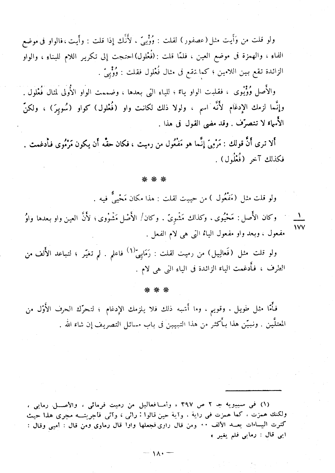 وَلَو قلت من وَأَيت مثل (عُصْفُور) لَقلت وُؤْييّ لأَنَّك إِذا قلت وأَيت فالواو فِي مَوضِع الفاءِ والهمزة فِي مَوضِع الْعين فلمّا قلت (فُعْلول) احتجت إِلى تَكْرِير اللَّام للبناءِ وَالْوَاو الزَّائِدَة تقع بَين اللامين كَمَا تقع فِي مِثَال فُعْلول فَقلت وُؤْيِيّ والأَصل وُؤْئوي فقلبت الْوَاو يَاء للياءِ الَّتِي بعْدهَا وضممت الْوَاو الأُولى لمثال فُعْلول وإِنَّما لزمك الإِدغام لأَنَّه اسْم وَلَوْلَا ذَلِك لكَانَتْ وَاو (فُعْلول) كواو (سُويِرَ) وَلَكِن الأَسماءِ لَا تتصرّف وَقد مضى القَوْل فِي هَذَا أَلا ترى أَنَّ قَوْلك مَرْمِيّ إِنَّما هُوَ مَفْعُول من رميت فَكَانَ حقّه أَن يكون مَرْمُوي فأَدغمت فَكَذَلِك آخر (فُعْلُول) وَلَو قلت مثل (مَفْعُول) من حييت لَقلت هَذَا مَكَان مَحْييٌّ فِيهِ وَكَانَ الأَصل مَحْيُوي وَكَذَلِكَ مَشْوِيّ وَكَانَ / الأَصل مَشْؤوي لأَنَّ الْعين وَاو بعْدهَا واوُ مفعول وَبعد وَاو مفعول الياءُ الَّتِي هِيَ لَام الْفِعْل وَلَو قلت مثل (فَعالِيل) من رميت لَقلت رَمَايِيّ فَاعْلَم لم تغيّر لتباعد الأَلف من الطّرف فأَدغمت الياءَ الزَّائِدَة فِي الياءِ الَّتِي هِيَ لَام فأَمّا مثل طَوِيل وقويم وَمَا أَشبه ذَلِك فَلَا يلزمك الإِدغام لتحرّك الْحَرْف الأَوّل من المعتلَّين ونبيّن هَذَا بأَكثر من هَذَا التَّبْيِين فِي بَاب مسَائِل التصريف إِن شاءَ الله