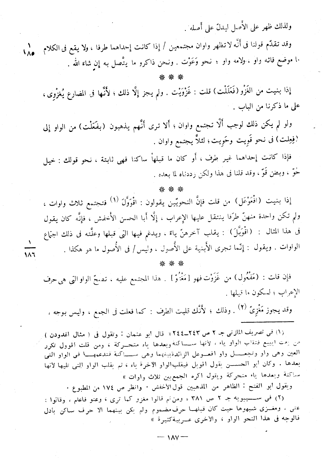 وَلذَلِك ظهر على الأَصل ليدلّ على أَصله وَقد تقدّم قَوْلنَا فِي أَنَّه لَا تظهر واوان مُجْتَمعين / إِذا كَانَت إِحداهما طرفا وَلَا يَقع فِي الْكَلَام مَا مَوضِع فائه وَاو ولامه وَاو نَحْو وَعَوْت وَنحن ذاكرو مَا يتَّصل بِهِ إِن شاءَ الله إِذا بنيت من الغَزْو (فَعَلَلْت) قلت غَزَوْيت وَلم يجز إِلاَّ ذَلِك لأَنَّها فِي الْمُضَارع يُغزْوِي على مَا ذكرنَا من الْبَاب وَلَو لم يكن ذَلِك لوَجَبَ أَلاَّ تَجْتَمِع واوان أَلا ترى أَنَّهم يذهبون (بفَعَلْت) من الْوَاو إِلى (فِعِلت) فِي نَحْو قَوِيت وحَوِيت لئلاَّ يجْتَمع واوان فإِذا كَانَت إِحداهما غير طرف أَو كَانَ مَا قبلهَا سَاكِنا فَهِيَ ثَابِتَة نَحْو قَوْلك خيل حُوّ وبطن قَوّ وَقد قُلْنَا فِي هَذَا وَلَكِن رددناه لما بعده إِذا بنيت (افْعَوْعَل) من قلت فإِنَّ النحويّين يَقُولُونَ اقْوَوَّلَ فتجتمع ثَلَاث واوات وَلم تكن وَاحِدَة منهنّ طرَفا ينْتَقل عَلَيْهَا الإِعراب إِلاَّ أَبا الْحسن الأَخفش فإِنَّه كَانَ يَقُول فِي هَذَا الْمِثَال (اقْوَيَّلَ) يقلب آخرهنّ يَاء ويدغم فِيهَا الَّتِي قبلهَا وعلَّته فِي ذَلِك اجْتِمَاع الواوات وَيَقُول إِنَّما تجْرِي الأَبنية على الأُصول وَلَيْسَ / فِي الأُصول مَا هُوَ هَكَذَا فإِن قلت (مَفْعُول) من غَزَوْت فَهُوَ {مَغْزُوّ} هَذَا الْمُجْتَمع عَلَيْهِ تصحّ الْوَاو الَّتِي هِيَ حرف الإِعراب لسكون مَا قبلهَا وَقد يجوز مَغْزِيّ وَذَلِكَ لأَنَّك قلبت الطّرف كَمَا فعلت فِي الْجمع وَلَيْسَ بِوَجْه