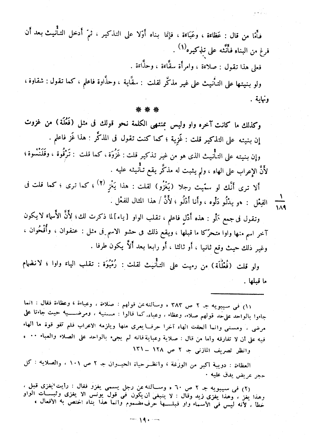 فأَمَّا من قَالَ عَظاءَة وعَبَاءَة فإِنما بناه أَوّلا على التَّذْكِير ثمّ أَدخل التأْنيث بعد أَن فرغ من البناءِ فأَنَّثه على تذكيره فعلى هَذَا تَقول صلاءَة وامرأَة سقَّاءَة وحذَّاءَة وَلَو بنيتها على التأْنيث على غير مذكَّر لَقلت سقَّاية وحذَّاوة فَاعْلَم كَمَا تَقول شقاوة وَنِهَايَة وَكَذَلِكَ مَا كَانَت آخِره وَاو وَلَيْسَ بمنتهى الْكَلِمَة نَحْو قَوْلك فِي مثل (فَعُلَة) من غزوت إِن بنيته على التَّذْكِير قلت غَزِية كَمَا كنت تَقول فِي المذكَّر هَذَا غَز فَاعْلَم وإِن بنيته على التأْنيث الَّذِي هُوَ من غير تذكير قلت غَزُوَة كَمَا قلت تَرْقُوة وقَلَنْسُوة لأَنَّ الإِعراب على الهاءِ وَلم يثبت لَهُ مذكَّر يَقع تأْنيثه عَلَيْهِ أَلا ترى أَنَّك لَو سمّيت رجلا (يَغْزُو) لَقلت هَذَا يَغْزٍ كَمَا ترى كَمَا قلت فِي الفِعْل هُوَ يدْلُو دَلْوه وأَنا أَدْلُو لأَنَّ / هَذَا الْمِثَال للفعْل وَتقول فِي جمع دَلْو هَذِه أَدْلٍ فَاعْلَم تقلب الْوَاو {يَاء} لما ذكرت لَك لأَنَّ الأَسماءَ لَا يكون آخر اسْم مِنْهَا واوا متحرّكا مَا قبلهَا وَيَقَع ذَلِك فِي حَشْو الِاسْم فِي مثل عنفوان وأُقْحُوان وَغير ذَلِك حَيْثُ وَقع ثَانِيًا أَو ثَالِثا أَو رَابِعا بعد أَلاَّ يكون طرفا وَلَو قلت (فُعْلُلَة) من رميت على التأْنيث لَقلت رُمْيُوَة تقلب الياءَ واوا لانضمام مَا قبلهَا