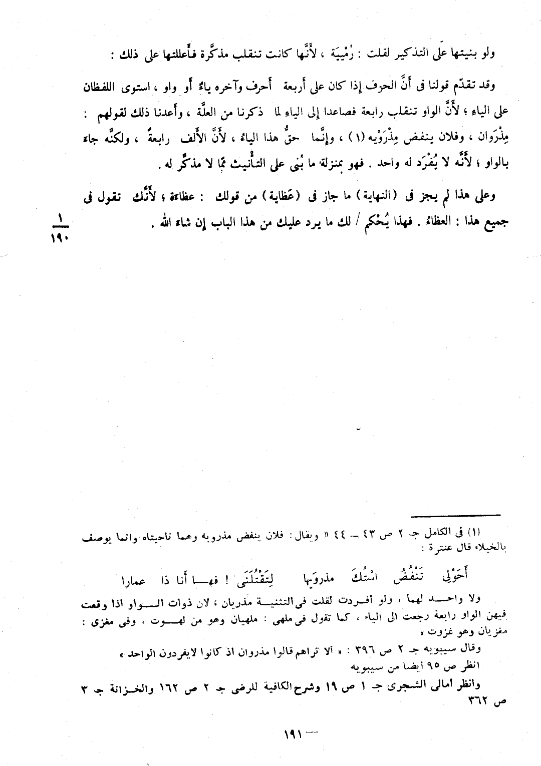 وَلَو بنيتها على التَّذْكِير لَقلت رُمْييَة لأَنَّها كَانَت تنْقَلب مذكَّرة فأَعللتها على ذَلِك وَقد تقدّم قَوْلنَا فِي أَنَّ الْحَرْف إِذا كَانَ على أَربعة أَحرف وَآخره ياءٌ أَو وَاو اسْتَوَى اللفظان على الياءِ لأَنَّ الْوَاو تنْقَلب رَابِعَة فَصَاعِدا إِلى الياءِ لما ذكرنَا من العلَّة وأَعدنا ذَلِك لقَولهم مِذْرَوان وَفُلَان ينفض مِذْرَوْيه وإِنَّما حقُّ هَذَا الياءُ لأَنَّ الأَلف رَابِعَة ولكنَّه جاءَ بِالْوَاو لأَنَّه لَا يُفْرَد لَهُ وَاحِد فَهُوَ بِمَنْزِلَة مَا بُنِي على التأَنيث ممّا لَا مذكَّر لَهُ وعَلى هَذَا لم يجز فِي (النِّهَايَة) مَا جَازَ فِي (عَظاية) من قَوْلك عظاءَة لأَنَّك تَقول فِي جَمِيع هَذَا العظاءُ فَهَذَا يُحْكم / لَك مَا يرد عَلَيْك من هَذَا الْبَاب إِن شاءَ الله