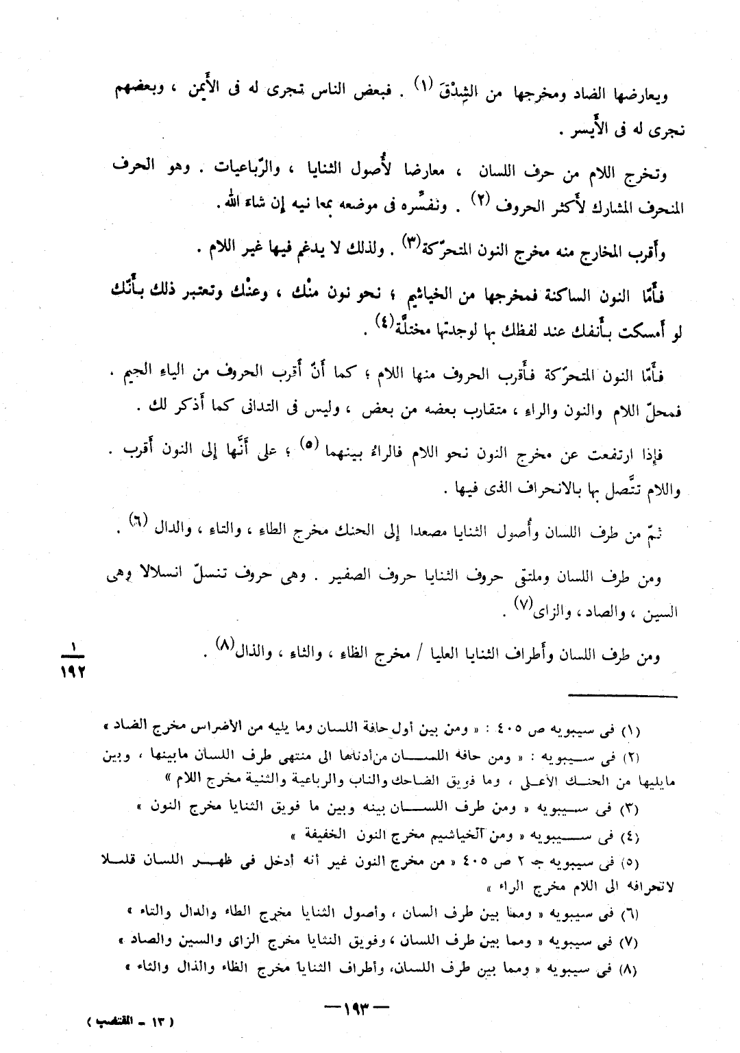 ويعارضها الضَّاد ومخرجها من الشِدْقَ فبعض النَّاس تجْرِي لَهُ فِي الأَيمن وَبَعْضهمْ تجْرِي لَهُ فِي الأَيسر وَتخرج اللَّام من حُرُوف اللِّسَان مُعَارضا لأُصول الثنايا والرّباعيات وَهُوَ الْحَرْف المنحرف المشارك لأَكثر الْحُرُوف ونفسِّره فِي مَوْضِعه بمعانيه إِن شاءَ الله وأَقرب المخارج مِنْهُ مخرج النُّون المتحركّة وَلذَلِك لَا يدغم فِيهَا غير اللَّام فأَمّا النُّون الساكنة فمخرجها من الخياشيم نَحْو نون منْك وعنْك وَتعْتَبر ذَلِك بأَنّك لَو أَمسكت بأَنفك عِنْد لفظك بهَا لوجدتها مختلَّة فأَمّا النُّون المتحرّكة فأَقرب الْحُرُوف مِنْهَا اللَّام كَمَا أَنّ أَقرب الْحُرُوف من الياءِ الْجِيم فمحلّ اللَّام وَالنُّون والراءِ مُتَقَارب بعضه من بعض وَلَيْسَ فِي التداني كَمَا أَذكر لَك فإِذا ارْتَفَعت عَن مخرج النُّون نَحْو اللَّام فالراءُ بَينهمَا على أَنَّها إِلى النُّون أَقرب وَاللَّام تتَّصل بهَا بالانحراف الَّذِي قبلهَا ثمّ من طرف اللِّسَان وأُصول الثنايا مصعدا إِلَى الحنك مخرج الطاءِ والتاءِ وَالدَّال وَمن طرف اللِّسَان وملتقى حُرُوف الثنايا حُرُوف الصفير وَهِي حُرُوف تنسلّ انسلالا وَهِي السِّين وَالصَّاد وَالزَّاي وَمن طرف اللِّسَان وأَطراف الثنايا الْعليا / مخرج الظاءِ والثاءِ والذال