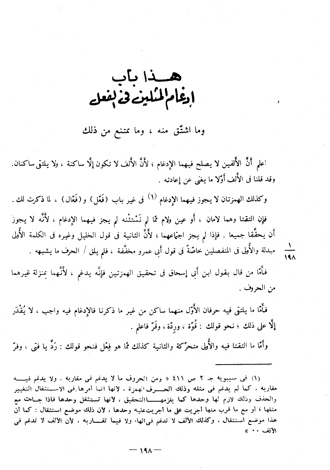 اعْلَم أَنَّ الأَلفين لَا يصلح فيهمَا الإِدغام لأَنَّ الأَلف لَا تكون إِلاَّ سَاكِنة وَلَا يلتقي ساكنان وَقد قُلْنَا فِي الأَلف أَوّلا مَا يُغني عَن إِعادته وَكَذَلِكَ الهمزتان لَا يجوز فيهمَا الإِدغام فِي غير بَاب (فَعّل) و (فَعّال) لما ذكرت لَك فإِن التقتا وهما لامان أَو عين وَلَام ممّا لم نَسْتثْنه لم يجز فيهمَا الإِدغام لأَنَّه لَا يجوز أَن يحقَّقا جَمِيعًا فإِذا لم يجز اجْتِمَاعهمَا لأَنَّ الثَّانِيَة فِي قَول الْخَلِيل وَغَيره فِي الْكَلِمَة الأُولى مبدلة والأُولى فِي المنفصلين خاصّةً فِي قَول أَبي عَمْرو مخفَّفة فَلم يلق / الْحَرْف مَا يُشبههُ فَأَما من قَالَ بقول ابْن أبي إِسْحَاق فِي تَحْقِيق الهمزتين فَإِنَّهُ يدغم، لِأَنَّهُمَا بِمَنْزِلَة غَيرهَا من الْحُرُوف فأَمَّا مَا يلتقي فِيهِ حرفان الأَوّل مِنْهُمَا سَاكن من غير مَا ذكرنَا فالإِدغام فِيهِ وَاجِب لَا يُقْدَر إِلاَّ على ذَلِك نَحْو قَوْلك قُوّة ورِدّة وقَرّ فَاعْلَم وأَمّا مَا التقتا فِيهِ والأُولى متحرّكة وَالثَّانيَِة كَذَلِك ممّا هُوَ فِعْل فنحو قَوْلك رَدَّ يَا فَتى وفرّ