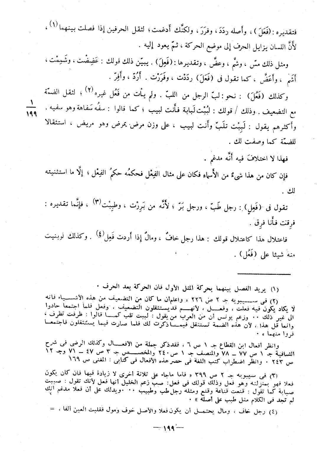 فتقديره (فَعَلَ) وأَصله ردَدَ وفرَرَ ولكنَّك أَدغمت لثقل الحرفين إِذا فصلت بَينهمَا لأَنَّ اللِّسَان يزايل الْحَرْف إِلى مَوضِع الْحَرَكَة ثمّ يعود إِليه وَمثل ذَلِك مسّ وشمَّ وعضَّ وتقديرها (فَعِلَ) يبيّن ذَلِك قَوْلك عَضِضْت وشَمِمْت أَشَم وأَعَضَّ كَمَا تَقول فِي (فَعَلَ) ردَدْت وفَرَرْت أَرُدّ وأَفِرّ وَكَذَلِكَ (فَعُلَ) نَحْو لبّ الرجل من اللبّ وَلم يَأْتِ من فَعُل غَيره لثقل الضمّة مَعَ التَّضْعِيف وَذَلِكَ / قَوْلك لبُبْت لَبابة فأَنت لَبِيب؛ كَمَا قَالُوا: سفه سفاهةً وَهُوَ سَفِيه وَأَكْثَرهم يَقُول: لببت تلب وَأَنت لَبِيب، على وزن مرض يمرض وَهُوَ مَرِيض استثقالا للضمّة كَمَا وصفت لَك فَهَذَا لَا اخْتِلَاف فِيهِ أَنَّه مدغم فإِن كَانَ من هَذَا شيءٌ من الأَسماءِ فَكَانَ على مِثَال الفِعْل فحكمُه حكمُ الفِعْل إِلاَّ مَا استثنيته لَك تَقول فِي (فَعِلٍ) رجل طَبّ وَرجل بَرّ لأَنَّه من بَرِرْت وطبِبْت فإِنَّما تَقْدِيره فرِقت فأَنا فرِق فاعتلال هَذَا كاعتلال قَوْلك هَذَا رجل خافٌ ومالٌ إِذا أَردت فَعِل وَكَذَلِكَ لَو بنيت مِنْهُ شَيْئا على (فَعُل)
