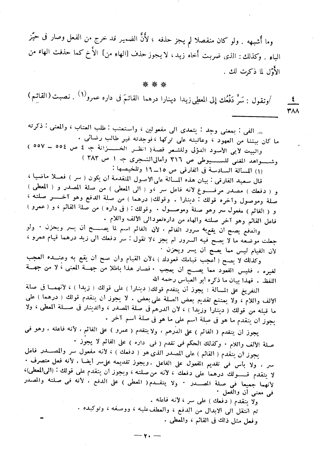 وَمَا أَشبهه وَلَو كَانَ مُنْفَصِلا لم يجز حذفه لأَنَّ الضَّمِير قد خرج من الْفِعْل وَصَارَ فِي حيِّز الباءِ وَكَذَلِكَ الَّذِي ضربت أَخاه زيد لَا يجوز حذف {الهاءِ من} الأَخ كَمَا حذفت الْهَاء من الأَوّل لما ذكرت لَك وَتقول سَرَّ دَفْعُك إِلى المعطِي زيدا دِينَارا درهما القائمَ فِي دَاره عَمْرو نصبت الْقَائِم