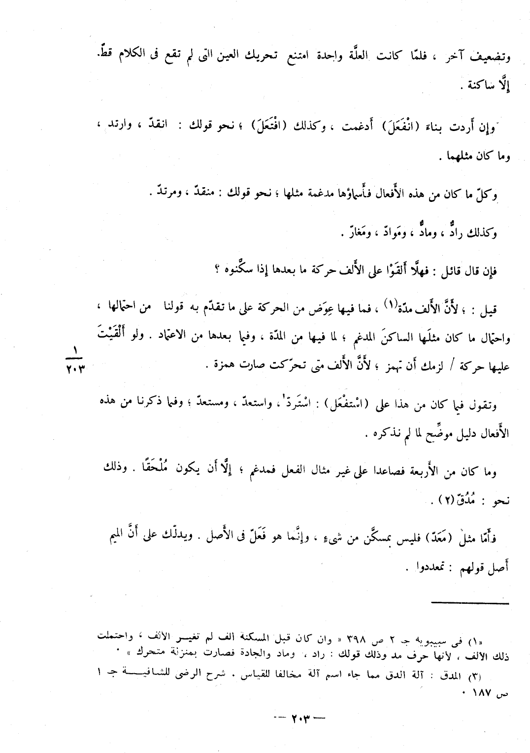 وتضعيف آخر فلمّا كَانَت العلَّة وَاحِدَة امْتنع تَحْرِيك الْعين الَّتِي لم تقع فِي الْكَلَام قطّ إِلاَّ سَاكِنة وإِن أَردت بناءَ (انْفَعَلَ) أَدغمت وَكَذَلِكَ (افْتَعَلَ) نَحْو قَوْلك انقدّ وارتد وَمَا كَانَ مثلهمَا وكلّ مَا كَانَ من هَذِه الأَفعال فأَسماؤها مدغمة مثلهَا نَحْو قَوْلك منقدّ ومرتدّ وَكَذَلِكَ رادٌّ ومادٌّ ومَوادّ ومَغارّ فإِن قَالَ قَائِل فهلاَّ أَلقَوْا على الأَلف حَرَكَة مَا بعْدهَا إِذا سكَّنوه قيل لأَنَّ الأَلف مدّة فَمَا فِيهَا عِوَض من الْحَرَكَة على مَا تقدّم بِهِ قَوْلنَا من احتمالها وَاحْتِمَال مَا كَانَ مثلَها الساكنَ المدغم لما فِيهَا من المدّة وَفِيمَا بعْدهَا من الِاعْتِمَاد وَلَو أَلْقَيْت عَلَيْهَا حَرَكَة / لزمك أَن تهمز لأَنَّ الأَلف مَتى تحرّكت صَارَت همزَة وَتقول فِيمَا كَانَ من هَذَا على (اسْتفْعَل) اسْتَردّ واستعدّ مستعدّ وَفِيمَا ذكرنَا من هَذِه الأَفعال دَلِيل موضِّح لما لم نذكرهُ وَمَا كَانَ من الأَربعة فَصَاعِدا على غير مِثَال الْفِعْل فمدغم إِلاَّ أَن يكون مُلْحَقاً وَذَلِكَ نَحْو مُدُقّ فأَمَّا مثل (مَعَدّ) فَلَيْسَ بمسكَّن من شيءٍ وإِنَّما هُوَ فَعَلَ فِي الأَصل ويدلّك على أَنَّ الْمِيم أَصل قَوْلهم تمعددوا