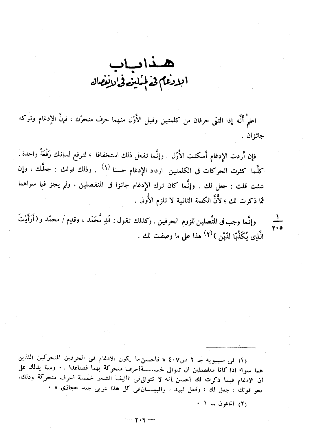 اعْلَم أَنَّه إِذا التقى حرفان من كَلِمَتَيْنِ وَقبل الأَوّل مِنْهُمَا حرف متحرّك فإِنَّ الإِدغام وَتَركه جائزان فإِن أَردت الْإِدْغَام أَسكنت الأَوّل وإِنَّما تفعل ذَلِك اسْتِخْفَافًا لترفع لسَانك رَفْعَةً وَاحِدَة كلَّما كثرت الحركات فِي الْكَلِمَتَيْنِ ازْدَادَ الإِدغام حسنا وَذَلِكَ قَوْلك جعلَّك وإِن شِئْت قلت جعل لَك وإِنَّما كَانَ ترك الإِدغام جَائِزا فِي المنفصلين وَلم يجز فِيمَا سواهُمَا ممّا ذكرت لَك لأَنَّ الْكَلِمَة الثَّانِيَة لَا تلْزم الأُولى وإِنَّما وَجب فِي المتَّصلين للُزُوم الحرفين وَكَذَلِكَ تَقول قَدِ مُّحَمّد وقدِم / محمّد و {أَرَأَيْتَ الَّذِي يُكَذِّبّ الدّيْن} هَذَا على مَا وصفت لَك