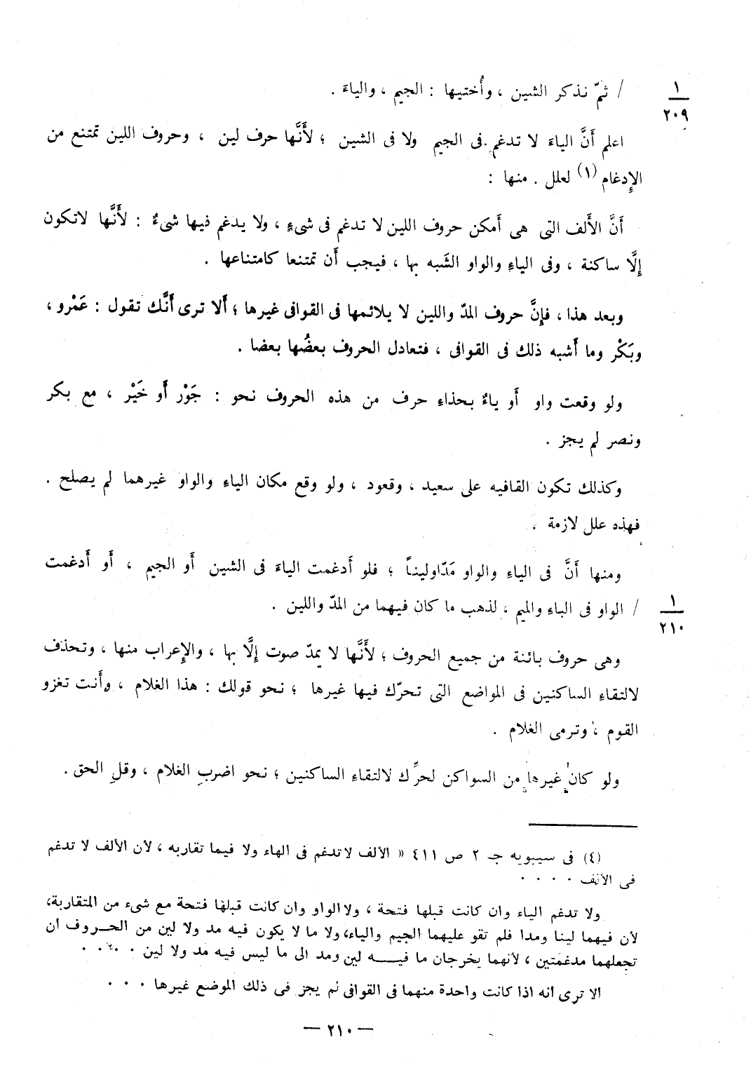 / ثمّ نذْكر الشين وأُختيها الْجِيم والياءَ اعْلَم أَنَّ الياءَ لَا تُدْغَم فِي الْجِيم وَلَا فِي الشين لأَنَّها حرف لين وحروف اللين تمْتَنع من الإِدغام لعلل مِنْهَا أَنَّ الأَلف الَّتِي هِيَ أَمكن حُرُوف اللين لَا تُدْغَم فِي شيءٍ وَلَا يدغم فِيهَا شيءٌ لأَنَّها لَا تكون إِلاَّ سَاكِنة وَفِي الياءِ وَالْوَاو الشَبه بهَا فَيجب أَن تمتنعا كامتناعها وَبعد هَذَا فإِنَّ حُرُوف المدّ واللين لَا يلائمها فِي القوافي غَيرهَا أَلا ترى أَنَّك تَقول عَمْرو وبَكْر وَمَا أَشبه ذَلِك فِي القوافي فتعادل الْحُرُوف بعضُها بَعْضًا وَلَو وَقعت وَاو أَو ياءٌ بحذاءٍ حرف من هَذِه الْحُرُوف نَحْو جَوْر أَو خَيْر مَعَ بكر وَنصر لم يجز وَكَذَلِكَ تكون القافية على سعيد وقعود وَلَو وَقع مَكَان الياءِ وَالْوَاو غَيرهمَا لم يصلح فَهَذِهِ علل لَازِمَة وَمِنْهَا أَنَّ فِي الياءِ وَالْوَاو مَدّاوليناً فَلَو أَدغمت الياءَ فِي الشين أَو الْجِيم أَو أَدغمت / الْوَاو فِي الباءِ وَالْمِيم لذهب مَا كَانَ فيهمَا من المدّ واللين وَهِي حُرُوف بَائِنَة من جَمِيع الْحُرُوف لأَنَّها لَا يمدّ صَوت إِلاَّ بهَا والإِعراب مِنْهَا وتحذف لالتقاءِ الساكنين فِي الْمَوَاضِع الَّتِي تحرّك فِيهَا غَيرهَا نَحْو قَوْلك هَذَا الْغُلَام وأَنت تغزو الْقَوْم وَتَرْمِي الْغُلَام وَلَو كَانَ غَيرهَا من السواكن لحرِّك لالتقاءِ الساكنين نَحْو اضربِ الْغُلَام وقلِ الْحق