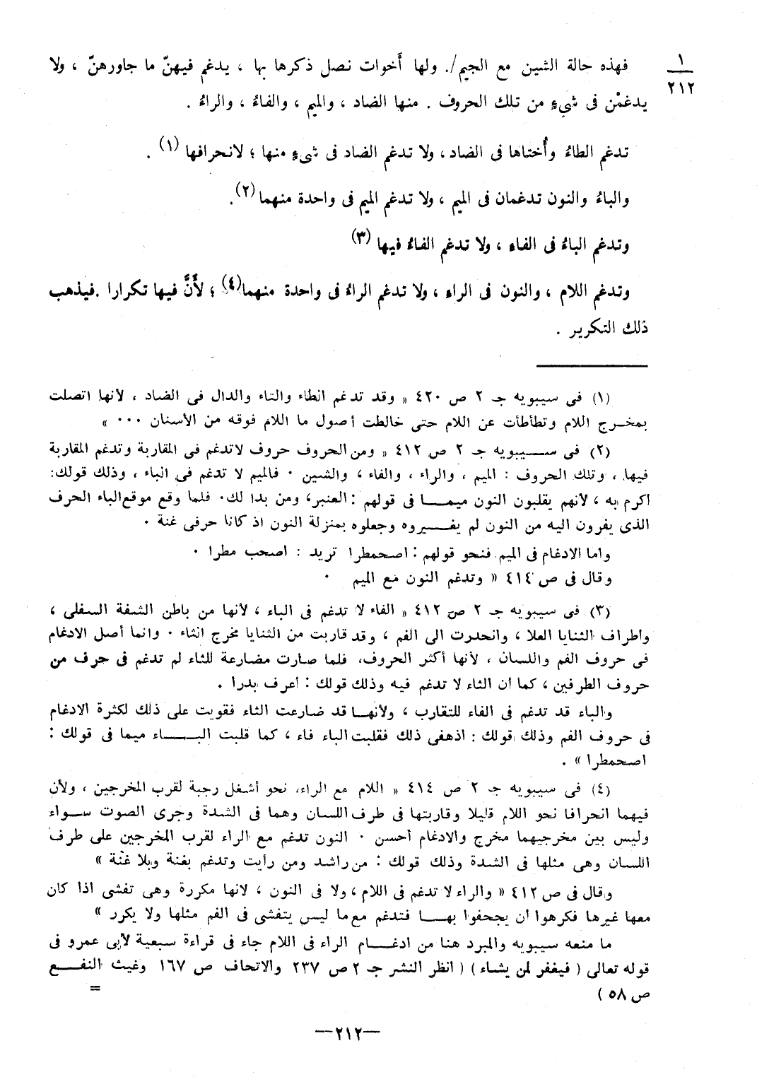 فَهَذِهِ حَالَة الشين مَعَ الْجِيم / وَلها أَخوات نصل ذكرهَا بهَا يدغم فيهنّ مَا جاورهنّ وَلَا يدغمْن فِي شيءٍ من تِلْكَ الْحُرُوف مِنْهَا الضَّاد وَالْمِيم والفاءُ والراءُ تُدْغَم الطاءُ وأُختاها فِي الضَّاد وَلَا تُدْغَم الضَّاد فِي شيءٍ مِنْهَا لانحرافها والباءُ وَالنُّون تدغمان فِي الْمِيم وَلَا تُدْغَم الْمِيم فِي وَاحِدَة مِنْهُمَا وتدغم الباءُ فِي الفاءِ وَلَا تُدْغَم الفاءُ فِيهَا وتدغم اللَّام وَالنُّون فِي الراءِ وَلَا تُدْغَم الراءُ فِي وَاحِدَة مِنْهُمَا لأَنَّ فِيهَا تَكْرَارا فَيذْهب ذَلِك التكرير