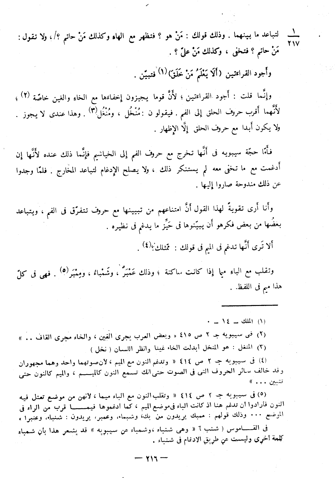 لتباعد مَا بَينهمَا وَذَلِكَ قَوْلك مَنْ هُوَ فتظهر مَعَ الهاءِ وَكَذَلِكَ مَنْ حَاتِم / وَلَا تَقول مَنْ حَاتِم فتخفى وَكَذَلِكَ مَنْ عليّ وأَجود القراءَتين {أَلا يعلم من خلق} فتبيّن وإِنَّما قلت أَجود القراءَتين لأَنَّ قوما يجيزون إِخفاءَها مَعَ الخاءِ والغين خاصّة لأَنَّهما أَقرب حُرُوف الْحلق إِلى الْفَم فَيَقُولُونَ مُنْخُل ومُنْغُل وَهَذَا عِنْدِي لَا يجوز وَلَا يكون أَبدا مَعَ حُرُوف الْحلق إِلاَّ الإِظهار فأَمَّا حجّة سِيبَوَيْهٍ فِي أَنَّها تخرج مَعَ حُرُوف الْفَم إِلى الخياشيم فإِنَّما ذَلِك عِنْده لأَنَّها إِن أَدغمت مَعَ مَا تخفى مَعَه لم يستنكر ذَلِك وَلَا يصلح الإِدغام لتباعد المخارج فلمّا وجدوا عَن ذَلِك مندوحة صَارُوا إِليها وأَنا أَرى تَقْوِيَة لهَذَا القَوْل أَنَّ امتناعهم من تبيينها مَعَ حُرُوف تتفرّق فِي الْفَم ويتباعد بعضُها من بعض فكرهوا أَن يبيّنوها فِي حَيِّز مَا يدغم فِي نَظِيره أَلا تَرى أَنَّها تُدْغَم فِي الْمِيم فِي قَوْلك مّمثلك وتقلب مَعَ الباءِ ميما إِذا كَانَت سَاكِنة وَذَلِكَ عَمْبَرٌ وشَمْباءُ ومِمْبَر فَهِيَ فِي كلّ هَذَا مِيم فِي اللَّفْظ