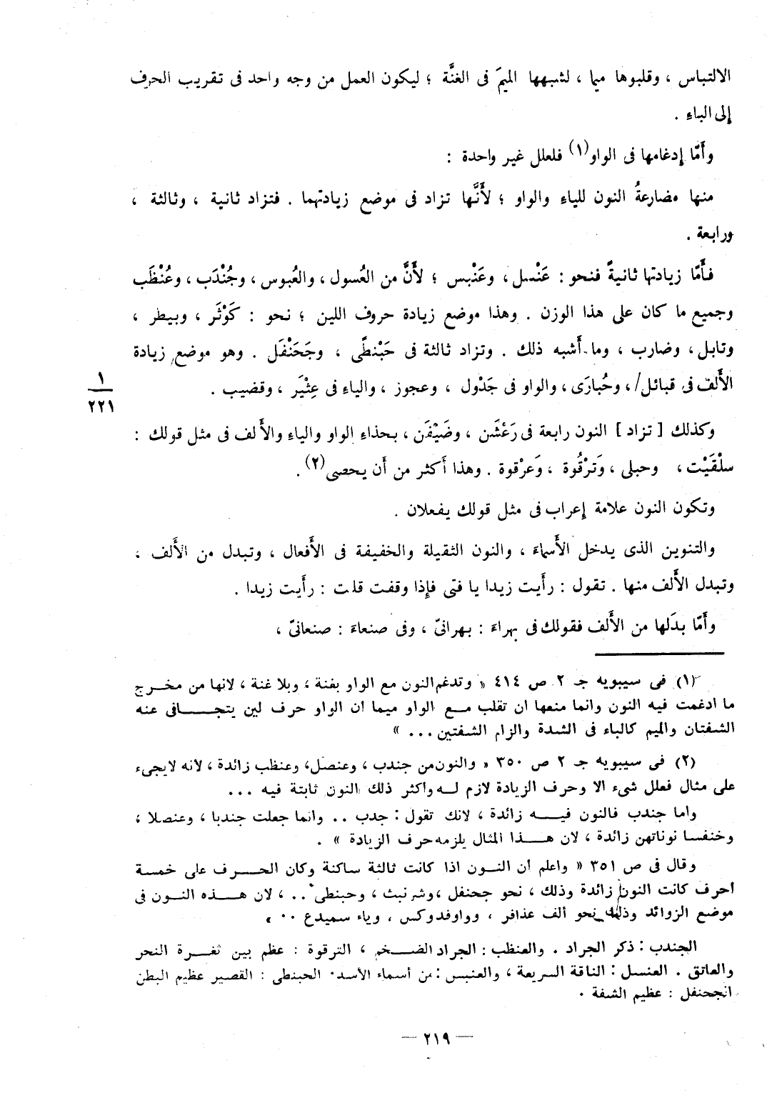الالتباس وقلبوها ميما لشبهها الميمَ فِي الغنَّة ليَكُون الْعَمَل من وَجه وَاحِد فِي تقريب الْحَرْف إِلى الباءِ وأَمّا إِدغامها فِي الْوَاو فلعلل غير وَاحِدَة مِنْهَا مضارعةُ النُّون للياءِ وَالْوَاو لأَنَّها تزاد فِي مَوضِع زيادتها فتزاد ثَانِيَة وثالثةَ ورابعة فأَمّا زيادتها ثَانِيَة فنحو عَنْسل وعَنْبس لأَنَّ من العُسول والعُبوس وجُنْدَب وعُنْظَب وَجَمِيع مَا كَانَ على هَذَا الْوَزْن وَهَذَا مَوضِع زِيَادَة حُرُوف اللين نَحْو كَوْثَر وبيطر وتابل وضارب وَمَا أَشبه ذَلِك وتزاد ثَالِثَة فِي حَبْنَطّي وجَحَنْفَل وَهُوَ مَوضِع زِيَادَة الأَلف فِي قبائل / وحُبارَى وَالْوَاو فِي جَدْول وعجوز والياءِ فِي عِثْيَر وقضيب وَكَذَلِكَ {تزاد} النُّون رَابِعَة فِي رَعْشَن وضَيْفَن بحذاءِ الْوَاو والياءِ والأَلف فِي مثل قَوْلك سلْقَيْت وحبلى وَترْقُوة وَعرْقوة وَهَذَا أَكثر من أَن يُحْصى وَتَكون النُّون عَلامَة إِعراب فِي مثل قَوْلك يفْعَلَانِ والتنوين الَّذِي يدْخل الأَسماءَ وَالنُّون الثَّقِيلَة والخفيفة فِي الأَفعال وتبدل من الأَلف وتبدل الأَلف مِنْهَا تَقول رأَيت زيدا يَا فَتى فإِذا وقفت قلت رأَيت زيدا وأَمّا بدَلها من الأَلف فقولك فِي بهراءَ بهرانيّ وَفِي صنعاءَ صنعانيّ