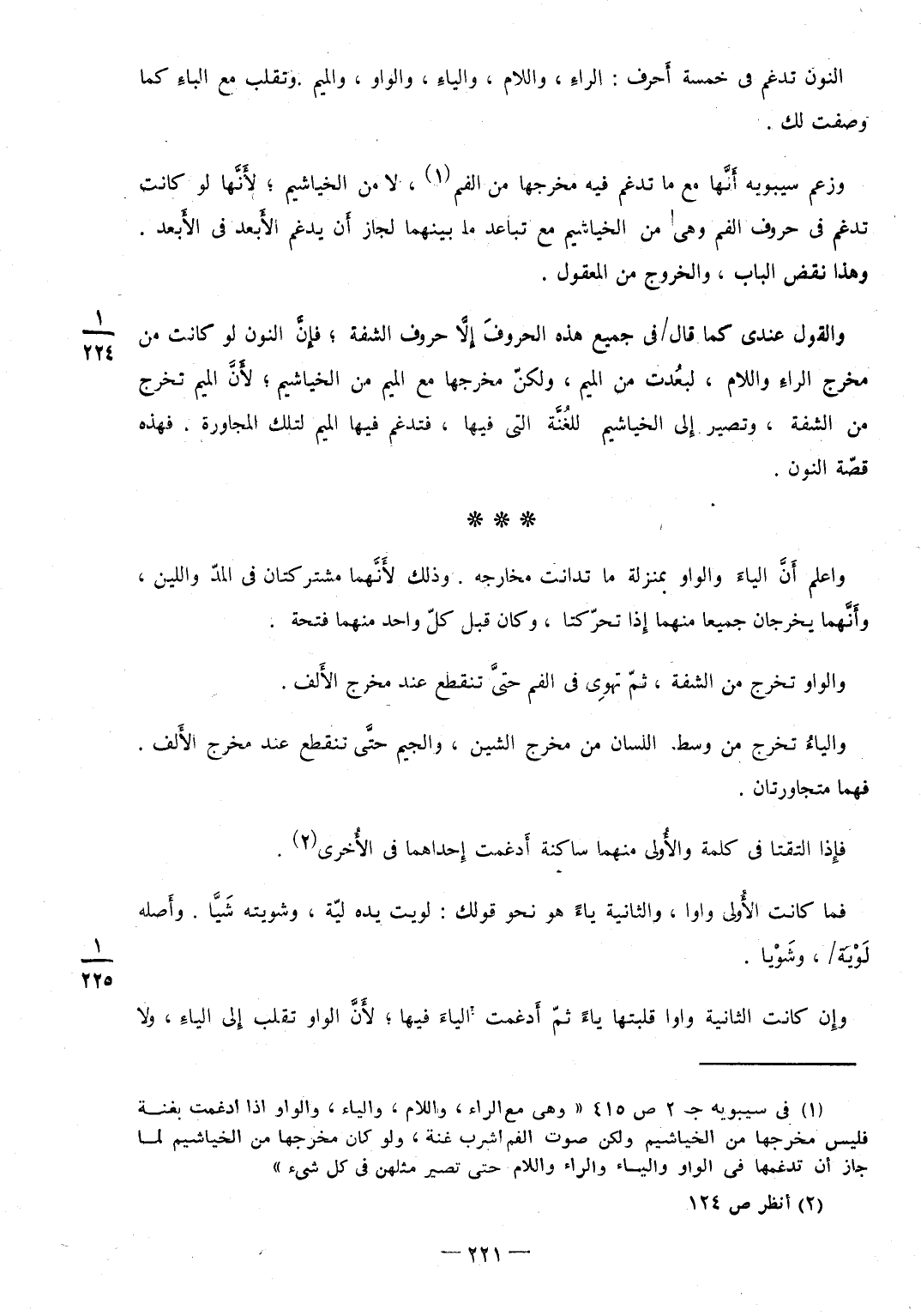 النُّون تُدْغَم فِي خَمْسَة أَحرف الراءِ وَاللَّام والياءِ وَالْوَاو وَالْمِيم وتقلب مَعَ الباءِ كَمَا وصفت لَك وَزعم سِيبَوَيْهٍ أَنَّها مَعَ مَا تُدْغَم فِيهِ مخرجها من الْفَم لَا من الخياشيم لأَنَّها لَو كَانَت تُدْغَم فِي حُرُوف الْفَم وَهِي من الخياشيم مَعَ تبَاعد مَا بَينهمَا لجَاز أَن يدغم الأَبعد فِي الأَبعد وَهَذَا نقض الْبَاب وَالْخُرُوج من الْمَعْقُول وَالْقَوْل عِنْدِي كَمَا قَالَ / فِي جَمِيع هَذِه الحروفَ إِلاّ حُرُوف الشّفة فإِنَّ النُّون لَو كَانَت من مخرج الراءِ وَاللَّام لبعُدت من الْمِيم ولكنّ مخرجها مَعَ الْمِيم من الخياشيم لأَنَّ الْمِيم تخرج من الشّفة وَتصير إِلى الخياشيم للغُنَّة الَّتِي فِيهَا فتدغم فِيهَا الْمِيم لتِلْك الْمُجَاورَة فَهَذِهِ قصّة النُّون وَاعْلَم أَنَّ الياءَ وَالْوَاو بِمَنْزِلَة مَا تدانت مخارجه وَذَلِكَ لأَنَّهما مشتركتان فِي المدّ واللين وأَنَّهما يخرجَانِ جَمِيعًا مِنْهُمَا إِذا تحرّكتا وَكَانَ قبل كلّ وَاحِد مِنْهُمَا فَتْحة وَالْوَاو تخرج من الشّفة ثمّ تهوِي فِي الْفَم حتَّى تَنْقَطِع عِنْد مخرج الأَلف والياءُ تخرج من وسط اللِّسَان من مخرج الشين وَالْجِيم حتَّى تَنْقَطِع عِنْد مخرج الأَلف فهما متجاورتان فإِذا التقتا فِي كلمة والأُولى مِنْهُمَا سَاكِنة أَدغمت إِحداهما فِي الأُخرى فَمَا كَانَت الأُولى واوا وَالثَّانيَِة يَاء هُوَ نَحْو قَوْلك لويت يَده ليّة وشويته شَيَّا وأَصله لَوْية / وشَوْيا وإِن كَانَت الثَّانِيَة واوا قلبتها يَاء ثمّ أَدغمت الياءَ فِيهَا لأَنَّ الْوَاو تقلب إِلى الياءِ وَلَا