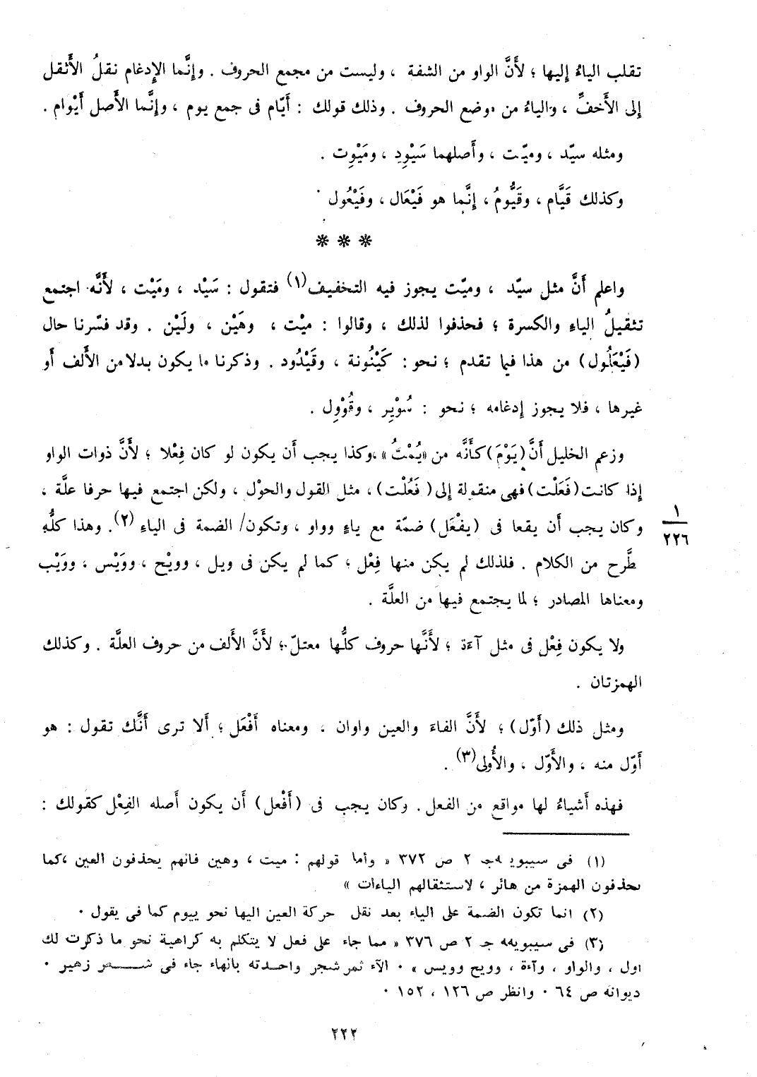 تقلب الياءُ إِليها لأَنَّ الْوَاو من الشّفة وَلَيْسَت من مجمع الْحُرُوف وإِنَّما الإِدغام نقلُ الأَثقل إِلى الأَخف والياءُ من مَوضِع الْحُرُوف وَذَلِكَ قَوْلك أَيّام فِي جمع يَوْم وإِنَّما الأَصل أَيْوام وَمثله سيّد وميّت وأَصلهما سَيْوِد ومَيْوِت وَكَذَلِكَ قَيَّام وقَيُّومُ إِنَّما هُوَ فَيْعَال وفَيْعُول وَاعْلَم أَنَّ مثل سيّد وميّت يجوز فِيهِ التَّخْفِيف فَتَقول سَيْد ومَيْت لأَنَّه اجْتمع تثقيل الياءِ والكسرة فحذفوا لذَلِك وَقَالُوا ميْت وهيْن ولَيْن وَقد فسّرنا حَال (فَيْعَلُول) من هَذَا فِيمَا تقدم نَحْو كَيْنُونة وقَيْدُود وَذكرنَا مَا يكون بَدَلا من الأَلف أَو غَيرهَا فَلَا يجوز إِدغامه نَحْو سُوِيْر وقُوْوِل وَزعم الْخَلِيل أَنَّ (يَوْمَ) كأَنَّه من " يُمْتُ " وَكَذَا يجب أَن يكون لَو كَانَ فِعْلا لأَنَّ ذَوَات الْوَاو إِذا كَانَت (فَعَلْت) فَهِيَ منقولة إِلى (فَعُلْت) مثل القَوْل والحوْل وَلَكِن اجْتمع فِيهَا حرفا علَّة وَكَانَ يجب أَن يقعا فِي (يفْعَل) ضمّة مَعَ ياءٍ وواو وَتَكون / الضمة فِي الياءِ وَهَذَا كلُّه مطَّرح من الْكَلَام فَلذَلِك لم يكن مِنْهَا فِعْل كَمَا لم يكن فِي ويل وويْح ووَيْس ووَيْب وَمَعْنَاهَا المصادر لما يجْتَمع فِيهَا من العلَّة وَلَا يكون فِعْل فِي مثل آءَة لأَنَّها حُرُوف كلُّها معتلّ لأَنَّ الأَلف من حُرُوف العلَّة وَكَذَلِكَ الهمزتان وَمثل ذَلِك (أَوّل) لأَنَّ الفاءَ وَالْعين واوان وَمَعْنَاهُ أَفْعَل أَلا ترى أَنَّك تَقول هُوَ أَوّل مِنْهُ والأَوّل والأُولى فَهَذِهِ أَشياءُ لَهَا مواقع من الْفِعْل وَكَانَ يجب فِي (أَفْعل) أَن يكون أَصله الفِعْل كَقَوْلِك