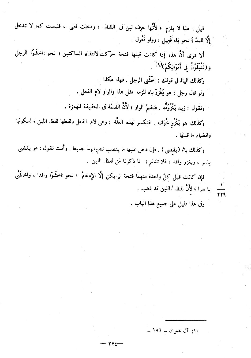 قيل هَذَا لَا يلْزم لأَنَّها حرف لين فِي اللَّفْظ وَدخلت الْمَعْنى فَلَيْسَتْ كَمَا لَا تدخل إِلاَّ للمدّ نَحْو ياءِ فَعِيل وواو فَعُول أَلا ترى أَنَّ هَذِه إِذا كَانَت قبلهَا فَتْحة حرّكت لالتقاءِ الساكنين نَحْو اخشَوُا الرجل و {لتبلون فِي أَمْوَالكُم} وَكَذَلِكَ الياءُ فِي قَوْلك اخْشَى الرجل فَهَذَا هَكَذَا وَلَو قَالَ رجل هُوَ يَغْزوَ باه للزمه مثل هَذَا وَالْوَاو لَام الْفِعْل وَتقول زيد يَغْزُوُمَّه فتضمّ الْوَاو لأَنَّ الضمّة فِي الْحَقِيقَة للهمزة وَكَذَلِكَ هُوَ يَغْزُوِ خْوانه فتكسر لهَذَا العلَّة وَهِي لَام الْفِعْل ولفظها لفظ اللين لسكونها وانضمام مَا قبلهَا وَكَذَلِكَ ياءُ (يقْضِي) فإِن دخل عَلَيْهَا مَا ينصب نصبتهما جَمِيعًا وأَنت تَقول هُوَ يقْضِي يَاسر ويغزو وَاقد فَلَا تُدْغَم لما ذكرنَا من لفظ اللين فإِن كَانَت قبل كلّ وَاحِدَة مِنْهُمَا فَتْحة لم يكن إِلاَّ الإِدغام نَحْو اخشَوْا واقدا واخشَىْ ياسرا لأَنَّ لفظ / اللين قد ذهب وَفِي هَذَا دَلِيل على جَمِيع هَذَا الْكتاب
