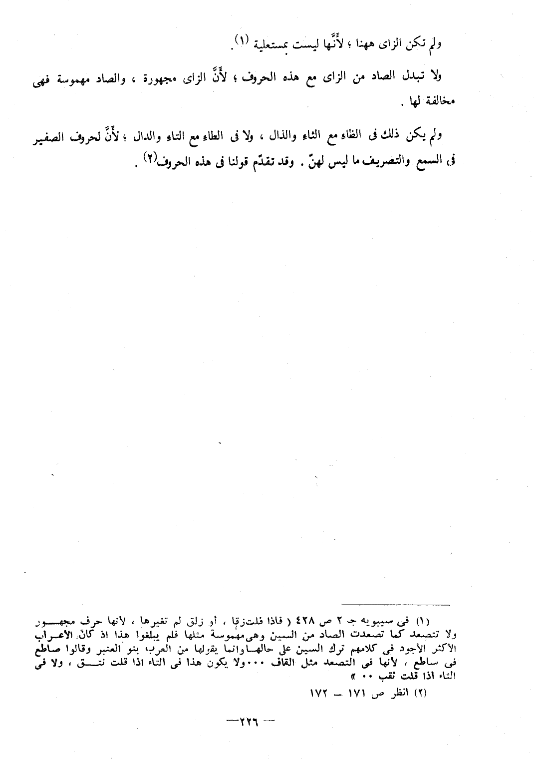 وَلم تكن الزَّاي هَهُنَا لأَنَّها لَيست بمستعلية وَلَا تبدل الصَّاد من الزَّاي مَعَ هَذِه الْحُرُوف لأَنَّ الزَّاي مجهورة وَالصَّاد مهموسة فَهِيَ مُخَالفَة لَهَا وَلم يكن ذَلِك فِي الظاءِ مَعَ الثاءِ والذال وَلَا فِي الطاءِ مَعَ التاءِ وَالدَّال لأَنَّ لحروف الصفير فِي السّمع والتصريف مَا لَيْسَ لهنّ وَقد تقدّم قَوْلنَا فِي هَذِه الْحُرُوف