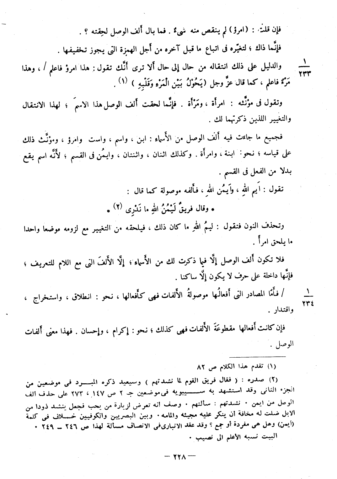 فإِن قلت (امرؤْ) لم ينقص مِنْهُ شيءٌ فَمَا بَال أَلف الْوَصْل لحِقته فإِنَّما ذَاك لتغيّره فِي اتِّبَاع مَا قبل آخِره من أَجل الْهمزَة الَّتِي يجوز تخفيفها وَالدَّلِيل على ذَلِك انْتِقَاله من حَال إِلى حَال أَلا ترى أَنَّك تَقول هَذَا امْرُؤ فَاعْلَم / وَهَذَا مَرْءٌ فَاعْلَم كَمَا قَالَ عزَّ وَجل {يَحُؤلُ بَيْن المَرْءِ وَقَلْبِهِ} وَتقول فِي مؤنَّثه امرأَة ومَرْأَة فإِنَّما لحقت أَلف الْوَصْل هَذَا الاسمَ لهَذَا الِانْتِقَال والتغيير اللَّذين ذكرتهما لَك فَجَمِيع مَا جاءَت فِيهِ أَلف الْوَصْل من الأَسماءِ ابْن وَاسم واست وامرؤ ومؤنَّث ذَلِك على قِيَاسه نَحْو ابْنة وامرأَة وَكَذَلِكَ اثْنَان وَاثْنَتَانِ وايمُن فِي الْقسم لأَنَّه اسْم يَقع بَدَلا من الْفِعْل فِي الْقسم تَقول اَيم اللهِ واَيمُن اللهِ فأَلفه مَوْصُولَة كَمَا قَالَ