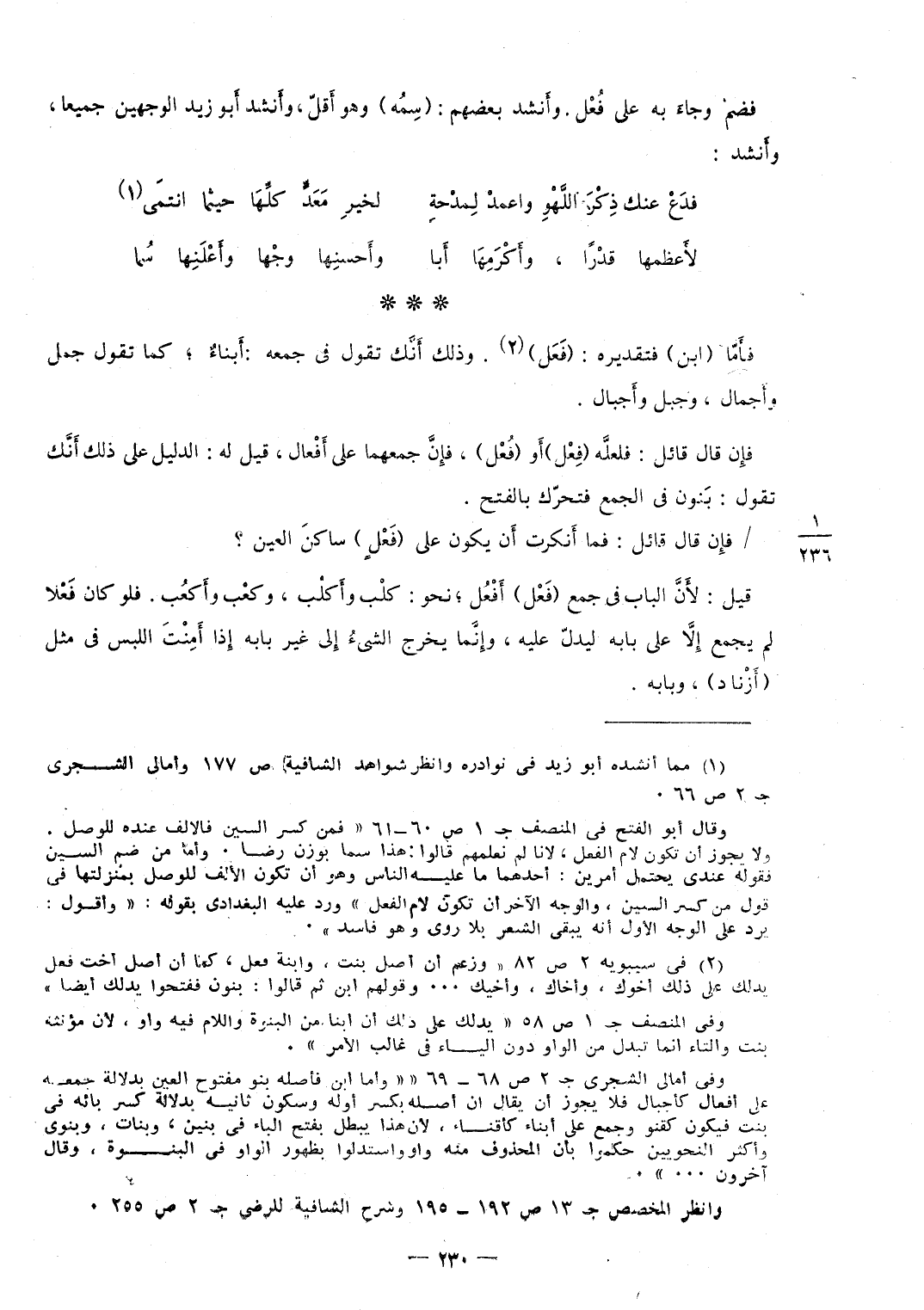 فأَمّا (ابْن) فتقديره فَعَل وَذَلِكَ أَنَّك تَقول فِي جمعه أَبناءٌ كَمَا تَقول جمل وأَجمال وجبل وأَجبال فإِن قَالَ قَائِل فلعلَّه (فِعْل) أَو (فُعْل) فإِنَّ جمعهَا على أَفْعال قيل لَهُ الدَّلِيل على ذَلِك أَنَّك تَقول بَنون فِي الْجمع فتحرّك بِالْفَتْح فإِن قَالَ قَائِل فَمَا أَنكرت أَن يكون على (فَعْل) ساكنَ الْعين قيل لأَنَّ الْبَاب فِي جمع (فَعْل) أَفْعُل نَحْو كلْب وأَكلْب وكعْب وأَكُعب فَلَو كَانَ فَعْلا لم يجمع إِلاَّ على بَابه ليدلّ عَلَيْهِ وإِنَّما يخرج الشيءُ إِلى غير بَابه إِذا أَمِنْتَ اللّبْس فِي مثل (أَزْناد) وبابه
