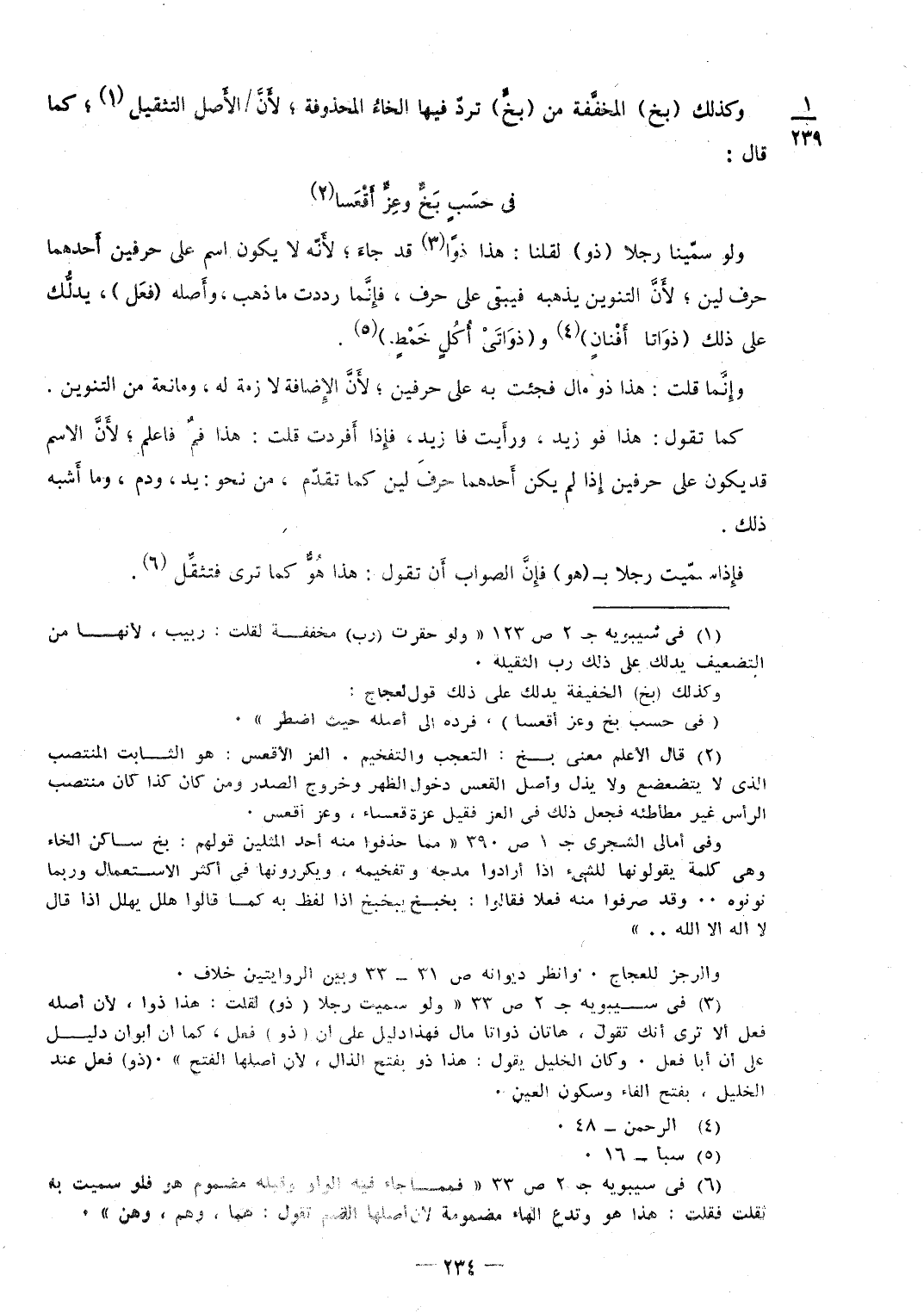 وَلَو سمّينا رجلا (ذُو) لقلنا هَذَا ذوّا قد جاءَ لأَنَّه لَا يكون اسْم على حرفين أَحدهما حرف لين لأَنَّ التَّنْوِين يذهبه فَيبقى على حرف فإِنَّما رددت مَا ذهب وأَصله (فعَل) يدلُّك على ذَلِك {ذواتا أفنان} و {ذواتي أكل خمط} وإِنَّما قلت هَذَا ذُو مَال فَجئْت بِهِ على حرفين لأَنَّ الإِضافة لَازِمَة لَهُ ومانعة من التَّنْوِين كَمَا تَقول هَذَا فو زيد ورأَيت فا زيد فإِذا أَفردت قلت هَذَا فمٌ فَاعْلَم لأَنَّ الِاسْم قد يكون على حرفين إِذا لم يكن أَحدهما حرفَ لين كَمَا تقدّم من نَحْو يَد وَدم وَمَا أَشبه ذَلِك فإِذا سمّيت رجلا ب (هُوَ) فإِنَّ الصَّوَاب أَن تَقول هَذَا هُوٌّ كَمَا ترى فتثقلِّ